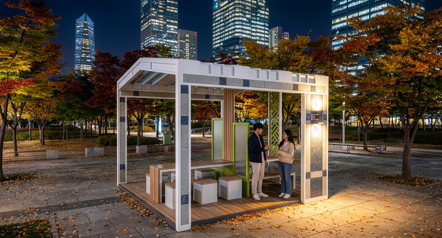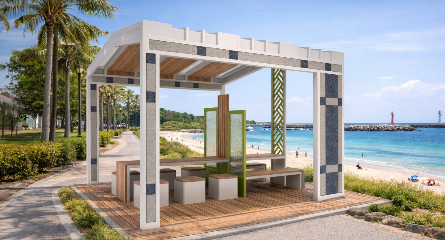 어반라운지 파빌리온 (Urban Lounge Pavilion)|GCP-1110 제품목록으로 바로가기 자료 및 바로가기 나라장터 바로연결 도면 다운로드 시공사진 보러가기 기타 개방형 구조와 목재 데크가 편안한 휴식을 제공하며, 테이블과 벤치 구성이 주민·가족의 소통과 커뮤니티 활동을 자연스럽게 지원하는 도심형 쉼터입니다. 제품명 어반라운지 파빌리온 (Urban Lounge Pavilion)|GCP-1110 물품식별번호 25483054 규격 3,900 × 4,000 × 3,300(H) 재질 stl, galvanized, polycarbonate, hard wood 어반라운지 파빌리온 (Urban Lounge Pavilion)|GCP-1110 물품식별번호 25483054 규격 3,900 × 4,000 × 3,300(H) 재질 stl, galvanized, polycarbonate, hard wood 기타 개방형 구조와 목재 데크가 편안한 휴식을 제공하며, 테이블과 벤치 구성이 주민·가족의 소통과 커뮤니티 활동을 자연스럽게 지원하는 도심형 쉼터입니다. 자료 및 바로가기 나라장터 바로연결 도면 다운로드 시공사진 보러가기