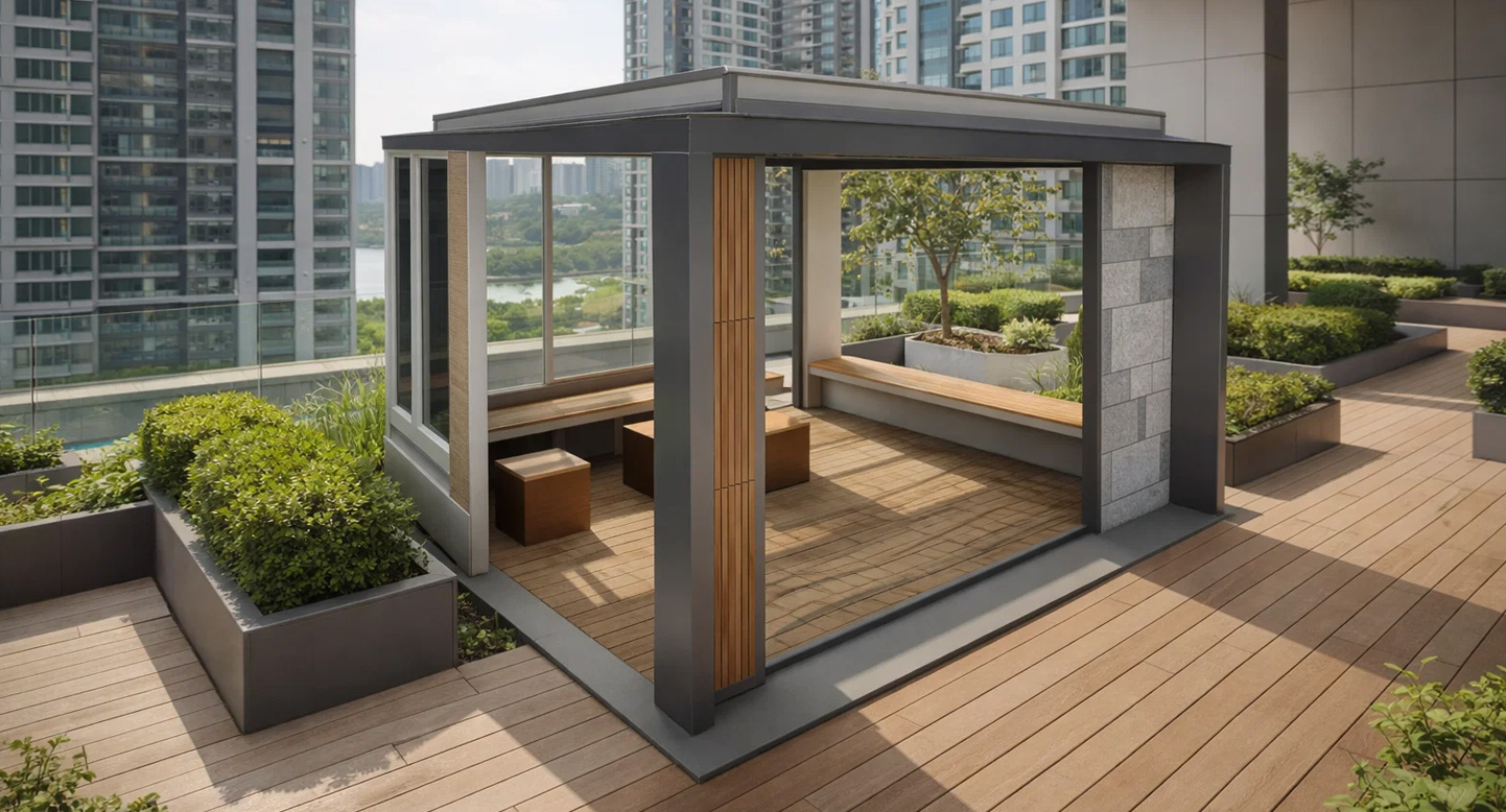 스퀘어쉼 파빌리온 (Square Shim Pavilion)|GC-P-1189 제품목록으로 바로가기 자료 및 바로가기 나라장터 바로연결 도면 다운로드 시공사진 보러가기 기타 채광형 지붕과 목재 데크가 편안한 휴식을 제공하며, 개방형 좌석 구성이 주민·가족·직장인의 소통과 커뮤니티 활동을 자연스럽게 지원하는 사계절형 쉼터입니다. 제품명 스퀘어쉼 파빌리온 (Square Shim Pavilion)|GC-P-1189 물품식별번호 25540495 규격 4,000 × 3,800 × 2,815(H) 재질 stl, galvanized, polycarbonate, hard wood, hpl 스퀘어쉼 파빌리온 (Square Shim Pavilion)|GC-P-1189 물품식별번호 25540495 규격 4,000 × 3,800 × 2,815(H) 재질 stl, galvanized, polycarbonate, hard wood, hpl 기타 채광형 지붕과 목재 데크가 편안한 휴식을 제공하며, 개방형 좌석 구성이 주민·가족·직장인의 소통과 커뮤니티 활동을 자연스럽게 지원하는 사계절형 쉼터입니다. 자료 및 바로가기 나라장터 바로연결 도면 다운로드 시공사진 보러가기