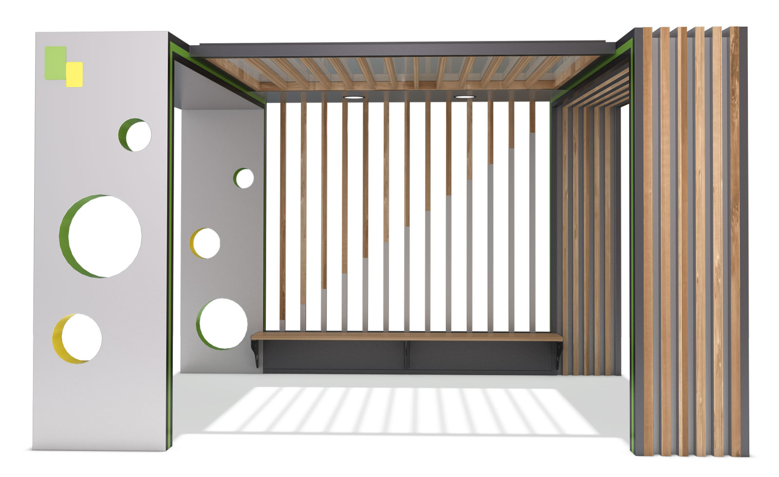 써클프레임 쉼터 (Circle Frame Shelter)|GGP-233B 제품목록으로 바로가기 자료 및 바로가기 나라장터 바로연결 도면 다운로드 시공사진 보러가기 기타 다양한 원형 포인트와 라인 배색을 활용해 밝고 젊은 분위기를 담아낸 쉼터입니다. 간결한 구조 안에 리듬감 있는 디테일을 더해 주변 공간과 자연스럽게 어우러지는 감성 휴식 공간입니다. 제품명 써클프레임 쉼터 (Circle Frame Shelter)|GGP-233B 물품식별번호 25651514 규격 4,000 × 3,600 × 2,600(H) 재질 stl, galvanized, hard wood, polycarbonate. solar 써클프레임 쉼터 (Circle Frame Shelter)|GGP-233B 물품식별번호 25651514 규격 4,000 × 3,600 × 2,600(H) 재질 stl, galvanized, hard wood, polycarbonate. solar 기타 다양한 원형 포인트와 라인 배색을 활용해 밝고 젊은 분위기를 담아낸 쉼터입니다. 간결한 구조 안에 리듬감 있는 디테일을 더해 주변 공간과 자연스럽게 어우러지는 감성 휴식 공간입니다. 자료 및 바로가기 나라장터 바로연결 도면 다운로드 시공사진 보러가기