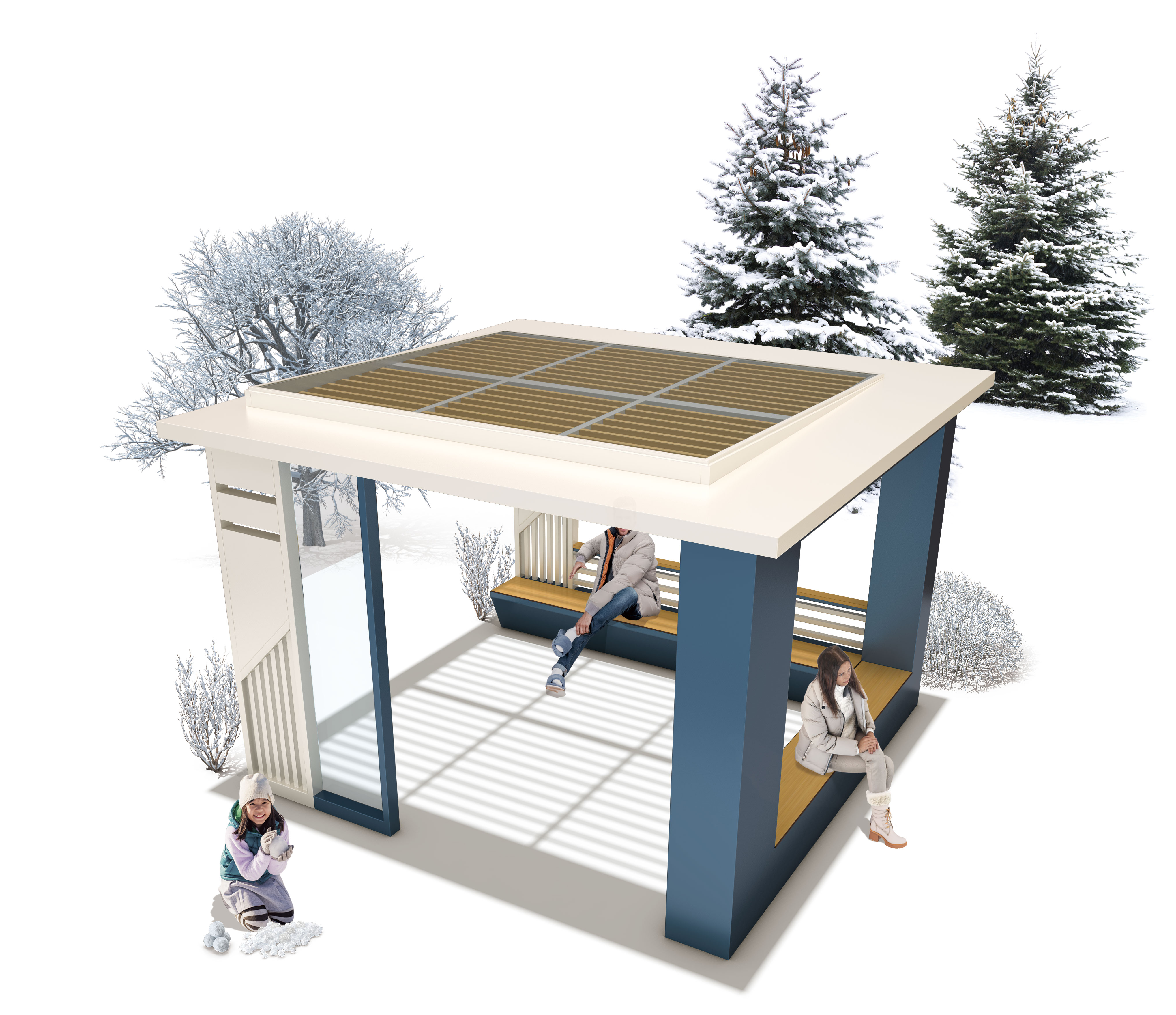 윈터블루 스퀘어파빌리온 (Winter Blue Square Pavilion)|GC-P-1128A 제품목록으로 바로가기 자료 및 바로가기 나라장터 바로연결 도면 다운로드 시공사진 보러가기 기타 단정한 사각 프레임과 블루 컬럼을 조합해 차분한 겨울 감성을 담았습니다. 상부 그리드 지붕은 눈부신 채광을 부드럽게 걸러내며, 한겨울에도 편안히 머물 수 있는 아늑한 휴식공간을 제공합니다. 제품명 윈터블루 스퀘어파빌리온 (Winter Blue Square Pavilion)|GC-P-1128A 물품식별번호 25651508 규격 4,000 × 4,000 × 2,700(H) 재질 stl, galvanized, polycarbonate, hard wood 윈터블루 스퀘어파빌리온 (Winter Blue Square Pavilion)|GC-P-1128A 물품식별번호 25651508 규격 4,000 × 4,000 × 2,700(H) 재질 stl, galvanized, polycarbonate, hard wood 기타 단정한 사각 프레임과 블루 컬럼을 조합해 차분한 겨울 감성을 담았습니다. 상부 그리드 지붕은 눈부신 채광을 부드럽게 걸러내며, 한겨울에도 편안히 머물 수 있는 아늑한 휴식공간을 제공합니다. 자료 및 바로가기 나라장터 바로연결 도면 다운로드 시공사진 보러가기