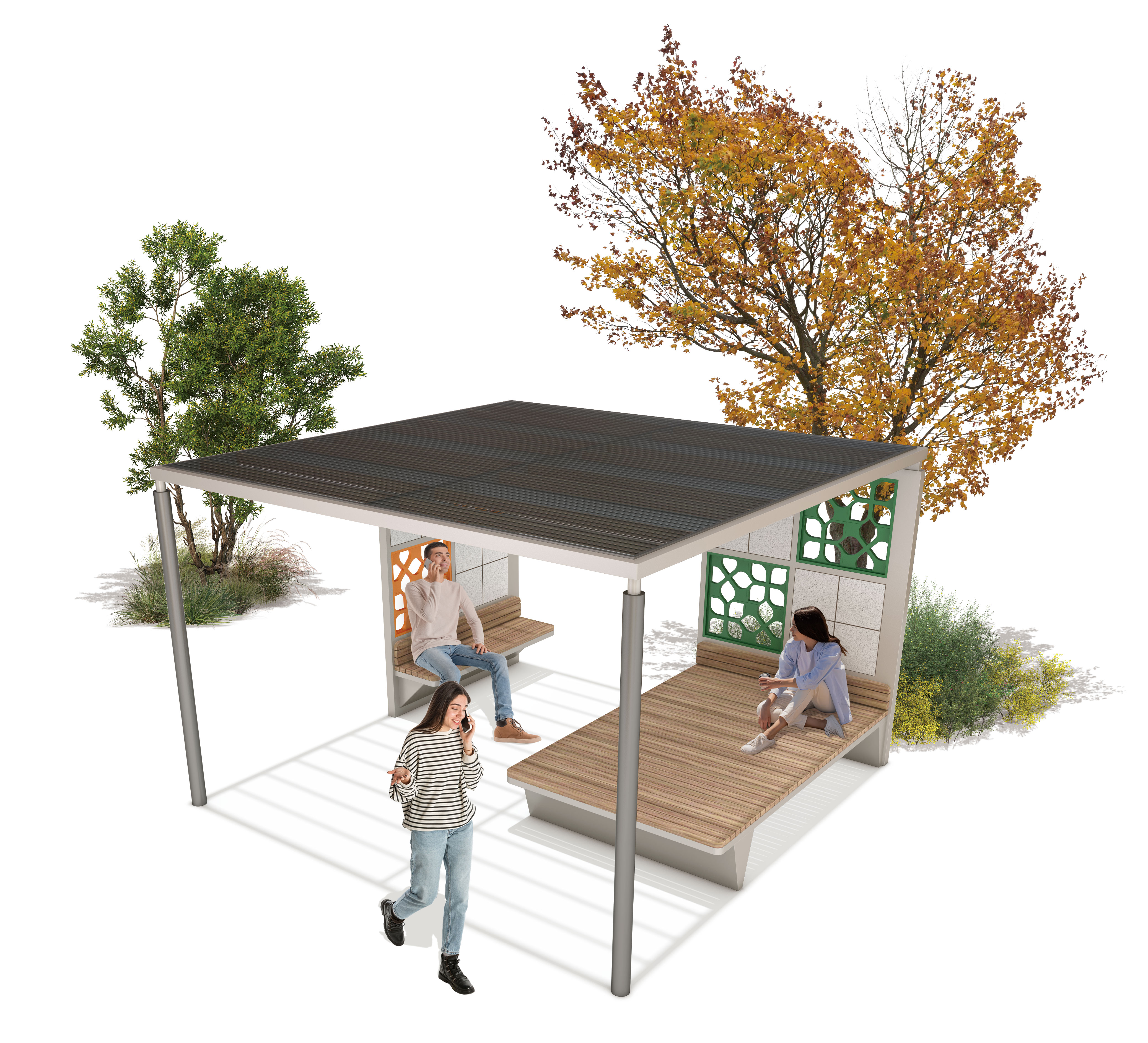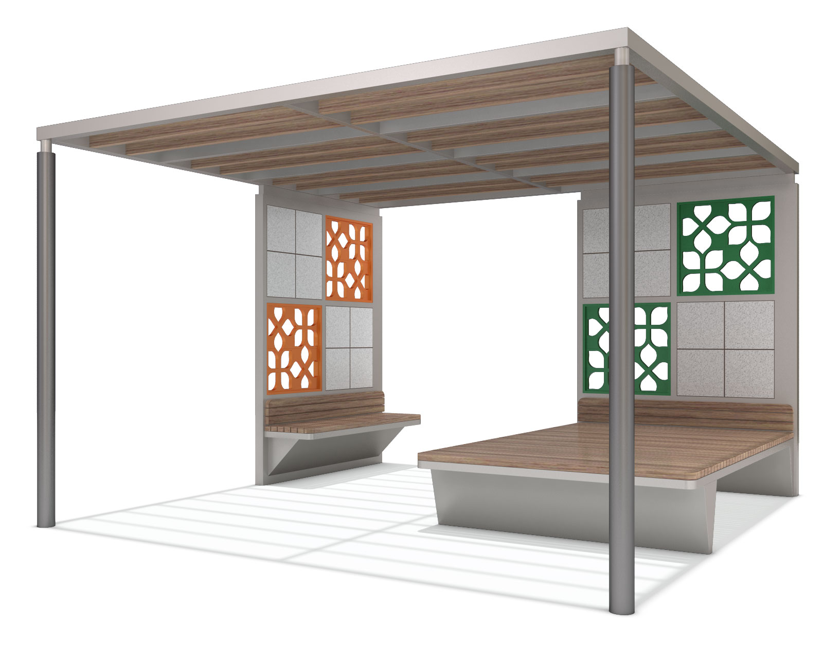 가든패턴 퍼걸러 (Garden Pattern Pergola)|GC-P-1136A 제품목록으로 바로가기 자료 및 바로가기 나라장터 바로연결 도면 다운로드 시공사진 보러가기 기타 컬러 패턴 패널과 우드 데크를 조합해 밝고 자연스러운 분위기를 만들며, 누구나 편안하게 머물 수 있는 개방형 휴식 공간으로 설계된 퍼걸러입니다. 제품명 가든패턴 퍼걸러 (Garden Pattern Pergola)|GC-P-1136A 물품식별번호 25651513 규격 3,627 × 3,613 × 2,425(H) 재질 stl, galvanized, polycarbonate, hard wood, birch plywood, hpl 가든패턴 퍼걸러 (Garden Pattern Pergola)|GC-P-1136A 물품식별번호 25651513 규격 3,627 × 3,613 × 2,425(H) 재질 stl, galvanized, polycarbonate, hard wood, birch plywood, hpl 기타 컬러 패턴 패널과 우드 데크를 조합해 밝고 자연스러운 분위기를 만들며, 누구나 편안하게 머물 수 있는 개방형 휴식 공간으로 설계된 퍼걸러입니다. 자료 및 바로가기 나라장터 바로연결 도면 다운로드 시공사진 보러가기
