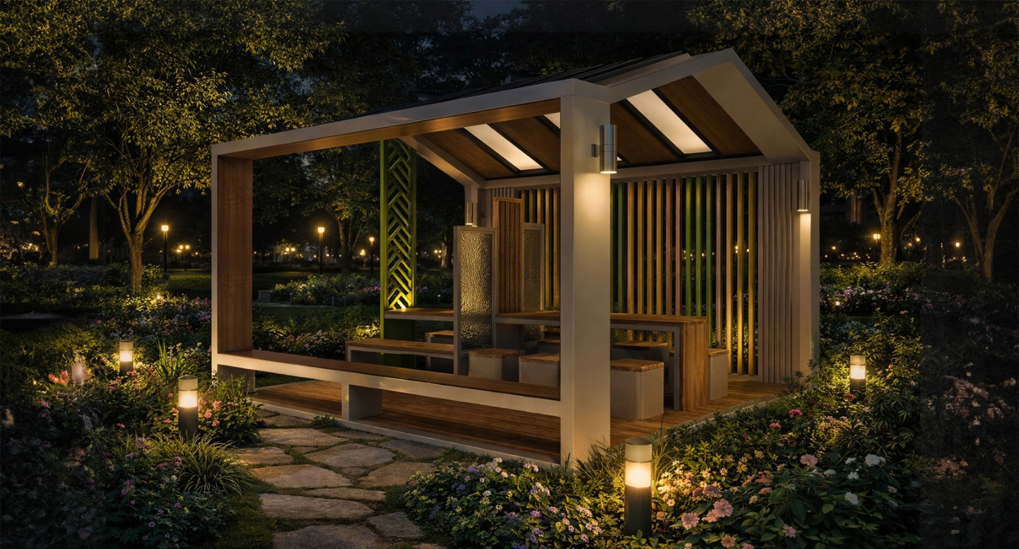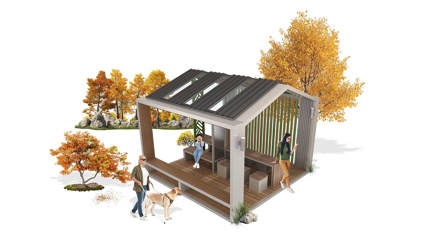 포레스트 라운지 파빌리온 (Forest Lounge Pavilion)|GC-P-1108 제품목록으로 바로가기 자료 및 바로가기 나라장터 바로연결 도면 다운로드 시공사진 보러가기 기타 목재 감성과 채광형 지붕으로 자연 속 휴식, 독서, 대화가 편안하게 이루어지는 개방형 쉼터입니다. 제품명 포레스트 라운지 파빌리온 (Forest Lounge Pavilion)|GC-P-1108 물품식별번호 25009238 규격 4,000 × 4,000 × 3,260(H) 재질 stl, galvanized, polycarbonate, hard wood 포레스트 라운지 파빌리온 (Forest Lounge Pavilion)|GC-P-1108 물품식별번호 25009238 규격 4,000 × 4,000 × 3,260(H) 재질 stl, galvanized, polycarbonate, hard wood 기타 목재 감성과 채광형 지붕으로 자연 속 휴식, 독서, 대화가 편안하게 이루어지는 개방형 쉼터입니다. 자료 및 바로가기 나라장터 바로연결 도면 다운로드 시공사진 보러가기