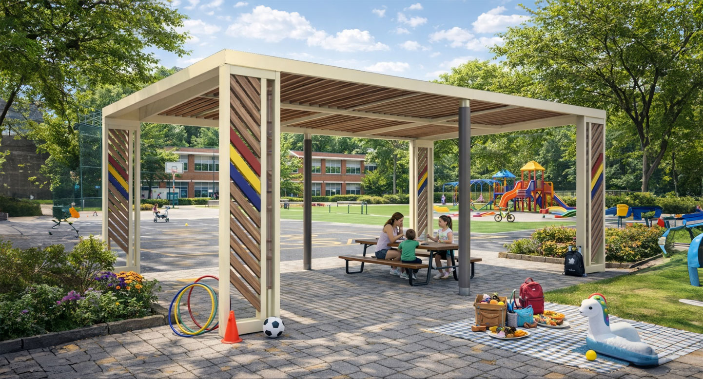 컬러 라인 쉼터 (Color Line Shelter)|GC-P-1701A 제품목록으로 바로가기 자료 및 바로가기 나라장터 바로연결 도면 다운로드 시공사진 보러가기 기타 기둥에 적용된 사선 우드 패턴과 포인트 컬러가 활기와 리듬감을 더하는 쉼터입니다. 공원·단지 동선에 생기를 부여하며, 아이들 놀이터 주변이나 커뮤니티 공간에 감각적인 휴식 분위기를 제공합니다. 제품명 컬러 라인 쉼터 (Color Line Shelter)|GC-P-1701A 물품식별번호 25639114 규격 6,000 × 3,000 × 2,600(H) 재질 stl, galvanized, polycarbonate, hard wood 컬러 라인 쉼터 (Color Line Shelter)|GC-P-1701A 물품식별번호 25639114 규격 6,000 × 3,000 × 2,600(H) 재질 stl, galvanized, polycarbonate, hard wood 기타 기둥에 적용된 사선 우드 패턴과 포인트 컬러가 활기와 리듬감을 더하는 쉼터입니다. 공원·단지 동선에 생기를 부여하며, 아이들 놀이터 주변이나 커뮤니티 공간에 감각적인 휴식 분위기를 제공합니다. 자료 및 바로가기 나라장터 바로연결 도면 다운로드 시공사진 보러가기