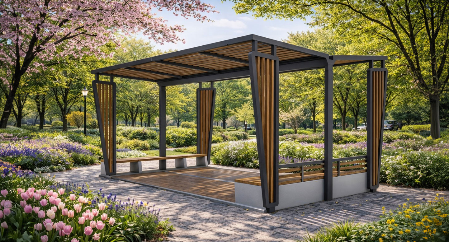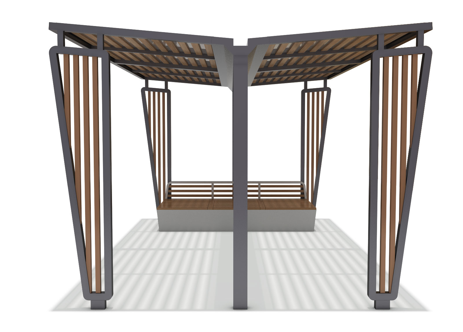 슬림커브 라운지 파빌리온 (Slim Curve Lounge Pavilion)|GC-P-1714 제품목록으로 바로가기 자료 및 바로가기 나라장터 바로연결 도면 다운로드 시공사진 보러가기 기타 사선형 슬림 기둥과 루버 차양으로 가벼운 구조미를 강조하고, 중앙 식재 공간과 통합 벤치가 자연친화적 휴식을 제공하는 열린 쉼터입니다. 제품명 슬림커브 라운지 파빌리온 (Slim Curve Lounge Pavilion)|GC-P-1714 물품식별번호 25615550 규격 7,500 × 4,000 × 3,000(H) 재질 stl, galvanized, polycarbonate, hard wood 슬림커브 라운지 파빌리온 (Slim Curve Lounge Pavilion)|GC-P-1714 물품식별번호 25615550 규격 7,500 × 4,000 × 3,000(H) 재질 stl, galvanized, polycarbonate, hard wood 기타 사선형 슬림 기둥과 루버 차양으로 가벼운 구조미를 강조하고, 중앙 식재 공간과 통합 벤치가 자연친화적 휴식을 제공하는 열린 쉼터입니다. 자료 및 바로가기 나라장터 바로연결 도면 다운로드 시공사진 보러가기