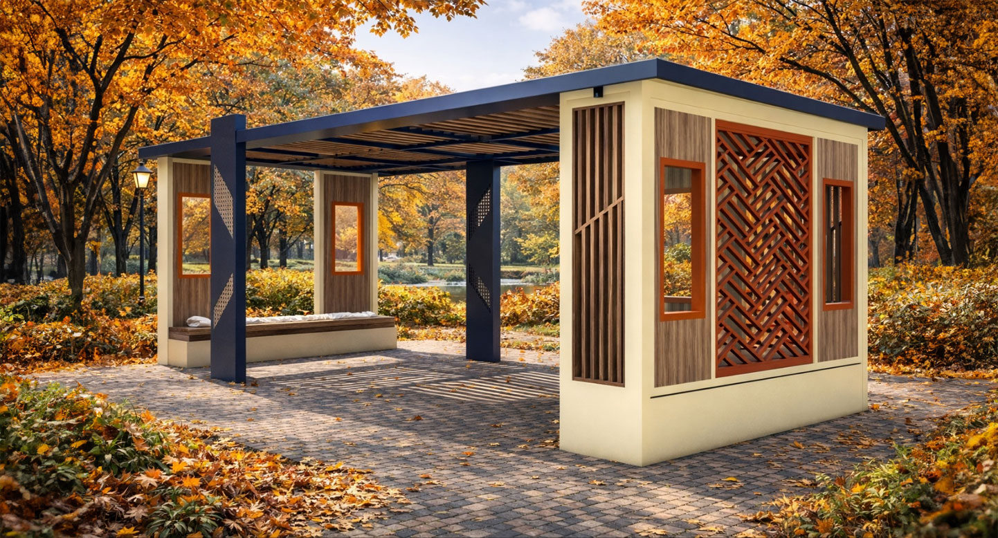 네이비 포인트 라운지 파빌리온 (Navy Point Lounge Pavilion)|GC-P-792A 제품목록으로 바로가기 자료 및 바로가기 나라장터 바로연결 도면 다운로드 시공사진 보러가기 기타 네이비 기둥과 우드 패널로 모던하고 따뜻한 분위기를 만든 파빌리온으로, 사선 패턴 벽체와 프레임 창이 다양한 채광을 연출하며 공원·캠퍼스 등에서 휴식과 활동을 동시에 지원합니다. 제품명 네이비 포인트 라운지 파빌리온 (Navy Point Lounge Pavilion)|GC-P-792A 물품식별번호 25651517 규격 7,500 × 3,600 × 2,700(H) 재질 stl, galvanized, polycarbonate, hard wood, hpl 네이비 포인트 라운지 파빌리온 (Navy Point Lounge Pavilion)|GC-P-792A 물품식별번호 25651517 규격 7,500 × 3,600 × 2,700(H) 재질 stl, galvanized, polycarbonate, hard wood, hpl 기타 네이비 기둥과 우드 패널로 모던하고 따뜻한 분위기를 만든 파빌리온으로, 사선 패턴 벽체와 프레임 창이 다양한 채광을 연출하며 공원·캠퍼스 등에서 휴식과 활동을 동시에 지원합니다. 자료 및 바로가기 나라장터 바로연결 도면 다운로드 시공사진 보러가기