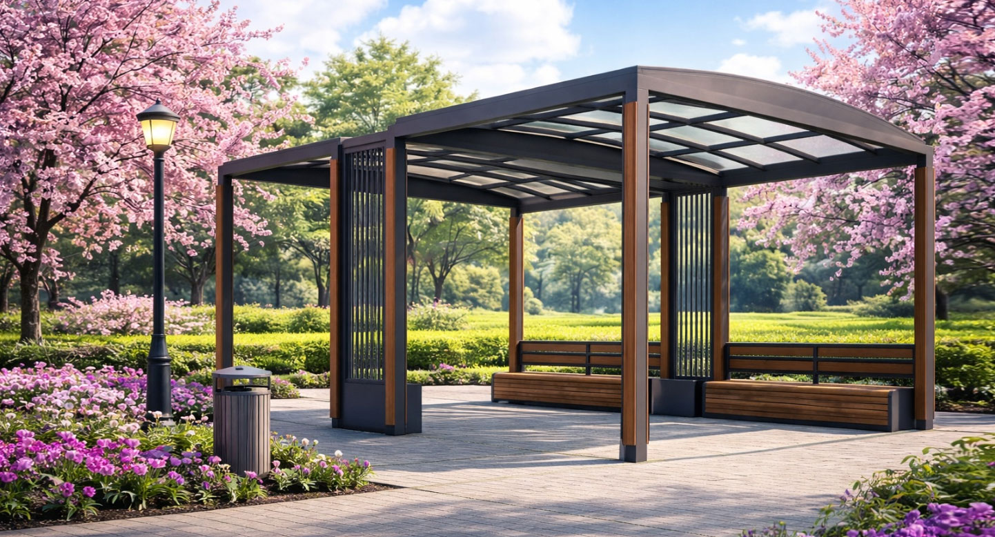커브루프 가든 파빌리온 (Curve Roof Garden Pavilion)|GC-P-117A 제품목록으로 바로가기 자료 및 바로가기 나라장터 바로연결 도면 다운로드 시공사진 보러가기 기타 부드러운 곡선 지붕과 우드·메탈 조합으로 자연 친화적 분위기를 만들고, 개방감과 부분 차광을 균형 있게 갖춰 공원·단지·산책로에서 편안한 휴식을 제공하는 쉼터입니다. 제품명 커브루프 가든 파빌리온 (Curve Roof Garden Pavilion)|GC-P-117A 물품식별번호 25639116 규격 5,800 × 3,860 × 2,820(H) 재질 stl, galvanized, hard wood, polycarbonate 커브루프 가든 파빌리온 (Curve Roof Garden Pavilion)|GC-P-117A 물품식별번호 25639116 규격 5,800 × 3,860 × 2,820(H) 재질 stl, galvanized, hard wood, polycarbonate 기타 부드러운 곡선 지붕과 우드·메탈 조합으로 자연 친화적 분위기를 만들고, 개방감과 부분 차광을 균형 있게 갖춰 공원·단지·산책로에서 편안한 휴식을 제공하는 쉼터입니다. 자료 및 바로가기 나라장터 바로연결 도면 다운로드 시공사진 보러가기