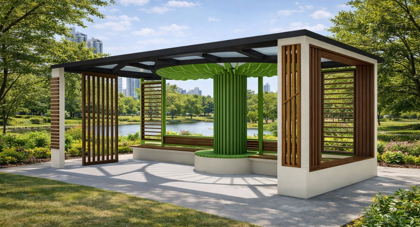 써클 그로브 퍼걸러 (Circle Grove Pergola)|GC-P-797 제품목록으로 바로가기 자료 및 바로가기 나라장터 바로연결 도면 다운로드 시공사진 보러가기 기타 중앙 원형 기둥과 방사형 천장이 나무 그늘 같은 자연 휴식감을 주며, 공원·캠퍼스·마을쉼터에 조화롭게 어울리는 디자인입니다. 제품명 써클 그로브 퍼걸러 (Circle Grove Pergola)|GC-P-797 물품식별번호 25010287 규격 7,000 × 3,600 × 2,600(H) 재질 stl, galvanized, polycarbonate, hard wood, hpl 써클 그로브 퍼걸러 (Circle Grove Pergola)|GC-P-797 물품식별번호 25010287 규격 7,000 × 3,600 × 2,600(H) 재질 stl, galvanized, polycarbonate, hard wood, hpl 기타 중앙 원형 기둥과 방사형 천장이 나무 그늘 같은 자연 휴식감을 주며, 공원·캠퍼스·마을쉼터에 조화롭게 어울리는 디자인입니다. 자료 및 바로가기 나라장터 바로연결 도면 다운로드 시공사진 보러가기