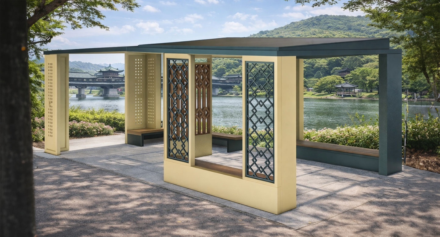 헤리티지 그리드 쉘터 (Heritage Grid Shelter)|GC-P-795 제품목록으로 바로가기 자료 및 바로가기 나라장터 바로연결 도면 다운로드 시공사진 보러가기 기타 격자형 루프와 전통 패턴 기둥을 조합해 품격과 개방감을 갖춘 쉼터로, 우드 벤치와 장식 요소가 어우러져 공원·단지·캠퍼스에서 감성적인 휴식과 소통 공간을 제공합니다. 제품명 헤리티지 그리드 쉘터 (Heritage Grid Shelter)|GC-P-795 물품식별번호 25010285 규격 8,000 × 4,000 × 3,040(H) 재질 stl, galvanized, polycarbonate, hard wood, hpl 헤리티지 그리드 쉘터 (Heritage Grid Shelter)|GC-P-795 물품식별번호 25010285 규격 8,000 × 4,000 × 3,040(H) 재질 stl, galvanized, polycarbonate, hard wood, hpl 기타 격자형 루프와 전통 패턴 기둥을 조합해 품격과 개방감을 갖춘 쉼터로, 우드 벤치와 장식 요소가 어우러져 공원·단지·캠퍼스에서 감성적인 휴식과 소통 공간을 제공합니다. 자료 및 바로가기 나라장터 바로연결 도면 다운로드 시공사진 보러가기