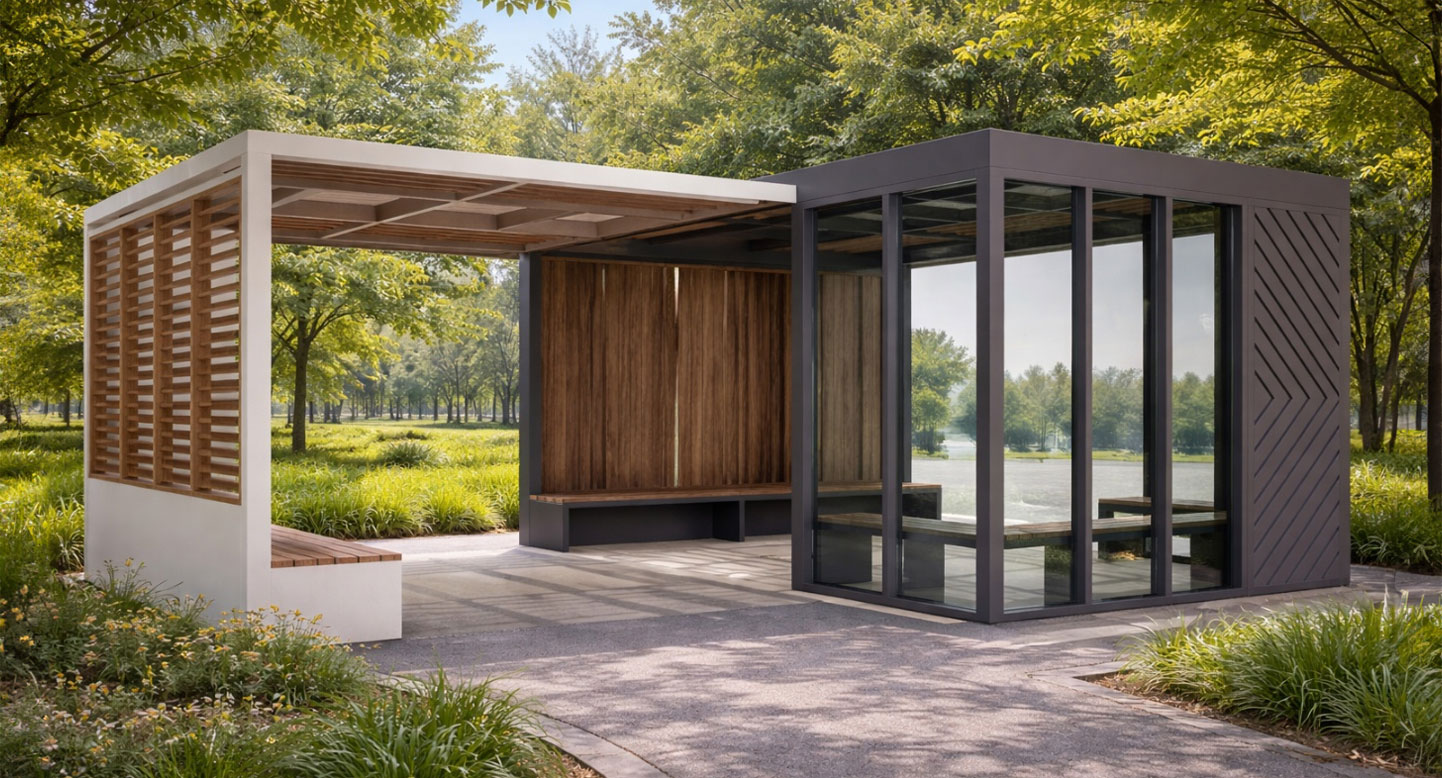 듀얼 하모니 쉘터 (Dual Harmony Shelter)|GC-P-759 제품목록으로 바로가기 자료 및 바로가기 나라장터 바로연결 도면 다운로드 시공사진 보러가기 기타 우드 라인과 유리 벽체가 조화를 이루는 복합형 쉘터로, 개방형·실내형 공간을 연결해 사계절 편안한 휴식과 소통을 제공합니다. 제품명 듀얼 하모니 쉘터 (Dual Harmony Shelter)|GC-P-759 물품식별번호 24752406 규격 6,000 × 4,500 × 2,700(H) 재질 stl, galvanized, polycarbonate, hard wood, hpl 듀얼 하모니 쉘터 (Dual Harmony Shelter)|GC-P-759 물품식별번호 24752406 규격 6,000 × 4,500 × 2,700(H) 재질 stl, galvanized, polycarbonate, hard wood, hpl 기타 우드 라인과 유리 벽체가 조화를 이루는 복합형 쉘터로, 개방형·실내형 공간을 연결해 사계절 편안한 휴식과 소통을 제공합니다. 자료 및 바로가기 나라장터 바로연결 도면 다운로드 시공사진 보러가기