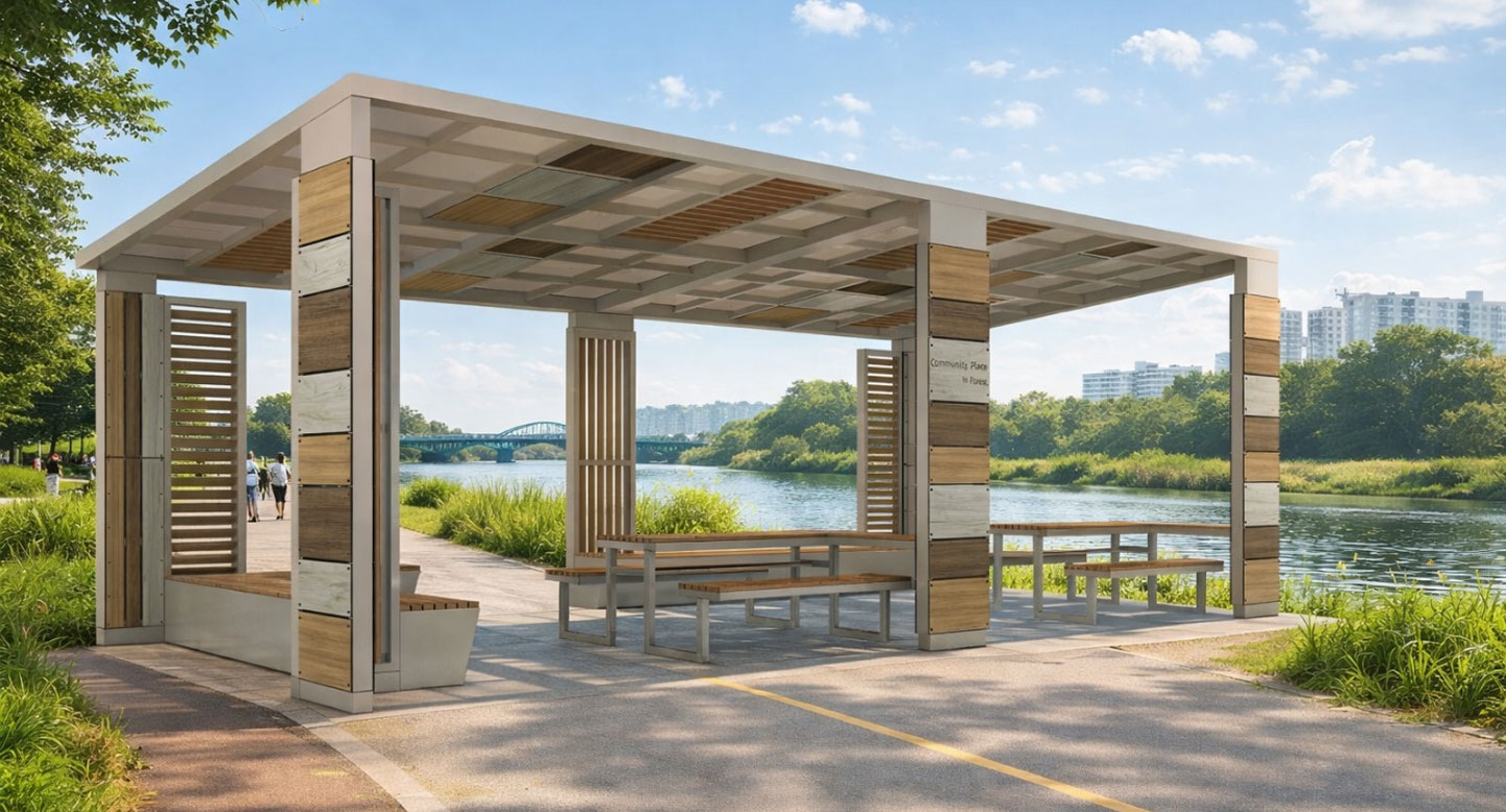 커뮤니티 라운지 파빌리온 (Community Lounge Pavilion)|GC-P-1742 제품목록으로 바로가기 자료 및 바로가기 나라장터 바로연결 도면 다운로드 시공사진 보러가기 기타 다양한 우드 컬러 패널과 개방형 구조로 편안한 분위기를 만들고, 자연광 루프와 함께 공원·캠퍼스·단지에서 누구나 머물며 소통할 수 있는 다목적 커뮤니티 쉼터입니다. 제품명 커뮤니티 라운지 파빌리온 (Community Lounge Pavilion)|GC-P-1742 물품식별번호 25651685 규격 8,000 × 4,000 × 2,865(H) 재질 stl, galvanized, polycarbonate, hard wood, hpl 커뮤니티 라운지 파빌리온 (Community Lounge Pavilion)|GC-P-1742 물품식별번호 25651685 규격 8,000 × 4,000 × 2,865(H) 재질 stl, galvanized, polycarbonate, hard wood, hpl 기타 다양한 우드 컬러 패널과 개방형 구조로 편안한 분위기를 만들고, 자연광 루프와 함께 공원·캠퍼스·단지에서 누구나 머물며 소통할 수 있는 다목적 커뮤니티 쉼터입니다. 자료 및 바로가기 나라장터 바로연결 도면 다운로드 시공사진 보러가기