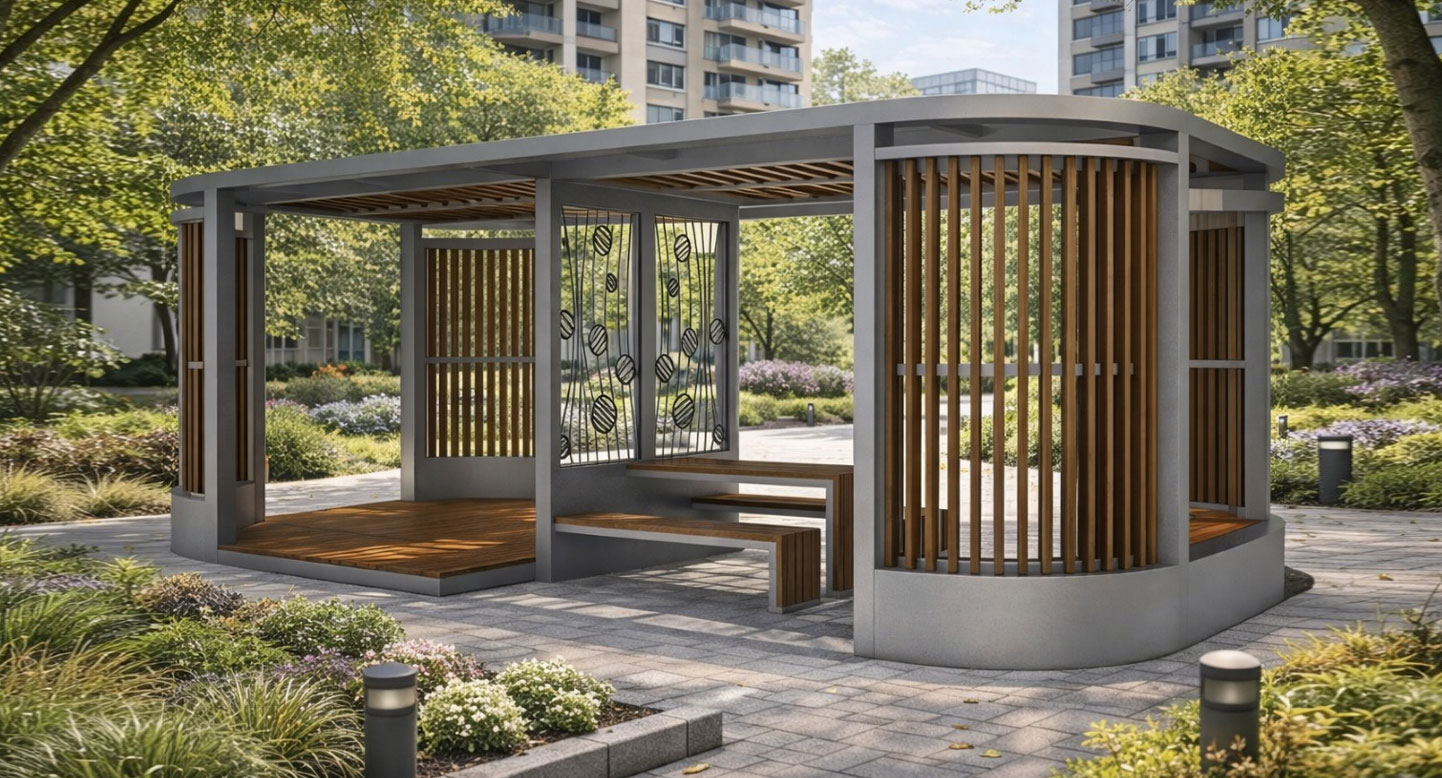 커브 라운지 파빌리온 (Curve Lounge Pavilion)|GC-P-711A 제품목록으로 바로가기 자료 및 바로가기 나라장터 바로연결 도면 다운로드 시공사진 보러가기 기타 곡선형 기둥과 루버 벽체가 시각적 부드러움과 독립된 휴식감을 제공합니다. 제품명 커브 라운지 파빌리온 (Curve Lounge Pavilion)|GC-P-711A 물품식별번호 25639127 규격 8,000 × 4,000 × 2,680(H) 재질 stl, galvanized, hard wood, polycarbonate 커브 라운지 파빌리온 (Curve Lounge Pavilion)|GC-P-711A 물품식별번호 25639127 규격 8,000 × 4,000 × 2,680(H) 재질 stl, galvanized, hard wood, polycarbonate 기타 곡선형 기둥과 루버 벽체가 시각적 부드러움과 독립된 휴식감을 제공합니다. 자료 및 바로가기 나라장터 바로연결 도면 다운로드 시공사진 보러가기