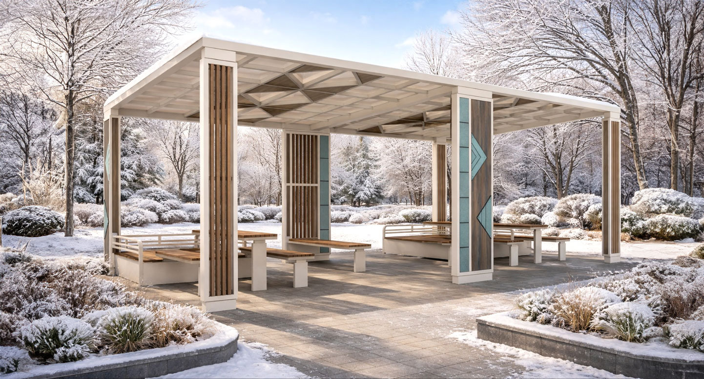 에코모듈 파빌리온 (Eco Module Pavilion)|GC-P-1739 제품목록으로 바로가기 자료 및 바로가기 나라장터 바로연결 도면 다운로드 시공사진 보러가기 기타 모듈형 구조와 우드 벤치를 결합한 커뮤니티 쉼터로, 개방형 루프를 통해 자연 채광을 살리며 공원·캠퍼스·단지에서 편안한 휴식과 소통 공간을 제공합니다. 제품명 에코모듈 파빌리온 (Eco Module Pavilion)|GC-P-1739 물품식별번호 25651682 규격 7,600 × 3,800 × 2,865(H) 재질 stl, galvanized, polycarbonate, hard wood, hpl 에코모듈 파빌리온 (Eco Module Pavilion)|GC-P-1739 물품식별번호 25651682 규격 7,600 × 3,800 × 2,865(H) 재질 stl, galvanized, polycarbonate, hard wood, hpl 기타 모듈형 구조와 우드 벤치를 결합한 커뮤니티 쉼터로, 개방형 루프를 통해 자연 채광을 살리며 공원·캠퍼스·단지에서 편안한 휴식과 소통 공간을 제공합니다. 자료 및 바로가기 나라장터 바로연결 도면 다운로드 시공사진 보러가기