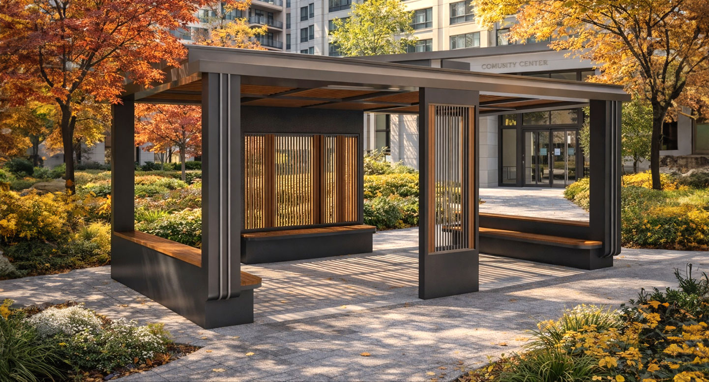 모듈라 쉼터 (Modular Shelter)|GC-P-702A 제품목록으로 바로가기 자료 및 바로가기 나라장터 바로연결 도면 다운로드 시공사진 보러가기 기타 기둥과 벤치를 모듈로 구성해 다양한 배치가 가능하며, 도심·단지·공원 어디서나 용도에 맞게 확장·축소해 활용할 수 있는 쉼터입니다. 제품명 모듈라 쉼터 (Modular Shelter)|GC-P-702A 물품식별번호 25639118 규격 7,000 × 3,600 × 2,700(H) 재질 stl, galvanized, hard wood, polycarbonate 모듈라 쉼터 (Modular Shelter)|GC-P-702A 물품식별번호 25639118 규격 7,000 × 3,600 × 2,700(H) 재질 stl, galvanized, hard wood, polycarbonate 기타 기둥과 벤치를 모듈로 구성해 다양한 배치가 가능하며, 도심·단지·공원 어디서나 용도에 맞게 확장·축소해 활용할 수 있는 쉼터입니다. 자료 및 바로가기 나라장터 바로연결 도면 다운로드 시공사진 보러가기