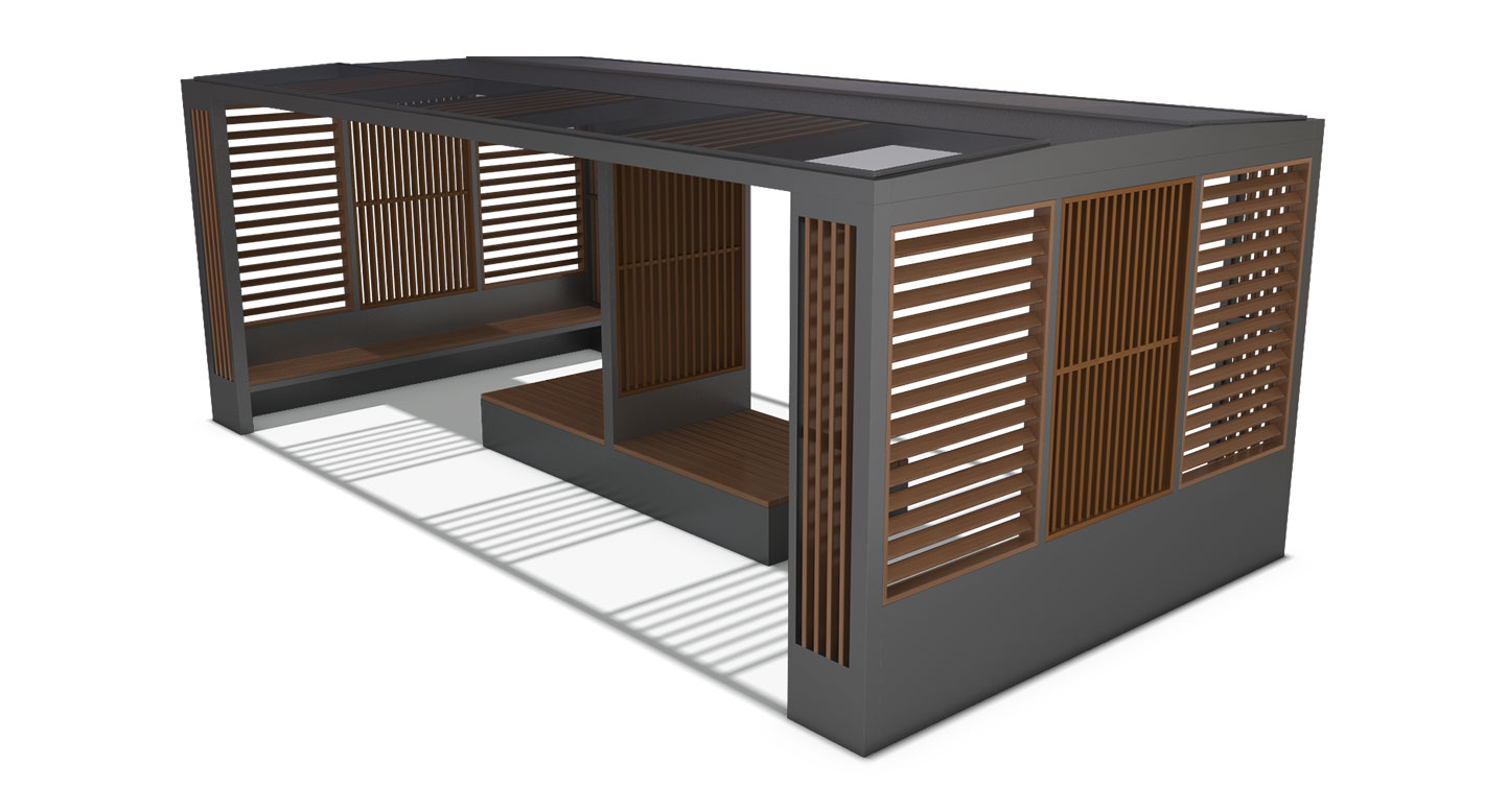 루버 라운지 쉼터 (Louver Lounge Shelter)|GC-P-710A 제품목록으로 바로가기 자료 및 바로가기 나라장터 바로연결 도면 다운로드 시공사진 보러가기 기타 수직 루버와 우드 좌석으로 아늑한 분위기를 만들고, 개방적이면서도 적당한 프라이버시를 제공해 공원·단지에서 편안한 소통과 휴식을 지원하는 쉼터입니다. 제품명 루버 라운지 쉼터 (Louver Lounge Shelter)|GC-P-710A 물품식별번호 25639126 규격 7,000 × 3,600 × 2,650(H) 재질 stl, galvanized, hard wood, polycarbonate 루버 라운지 쉼터 (Louver Lounge Shelter)|GC-P-710A 물품식별번호 25639126 규격 7,000 × 3,600 × 2,650(H) 재질 stl, galvanized, hard wood, polycarbonate 기타 수직 루버와 우드 좌석으로 아늑한 분위기를 만들고, 개방적이면서도 적당한 프라이버시를 제공해 공원·단지에서 편안한 소통과 휴식을 지원하는 쉼터입니다. 자료 및 바로가기 나라장터 바로연결 도면 다운로드 시공사진 보러가기