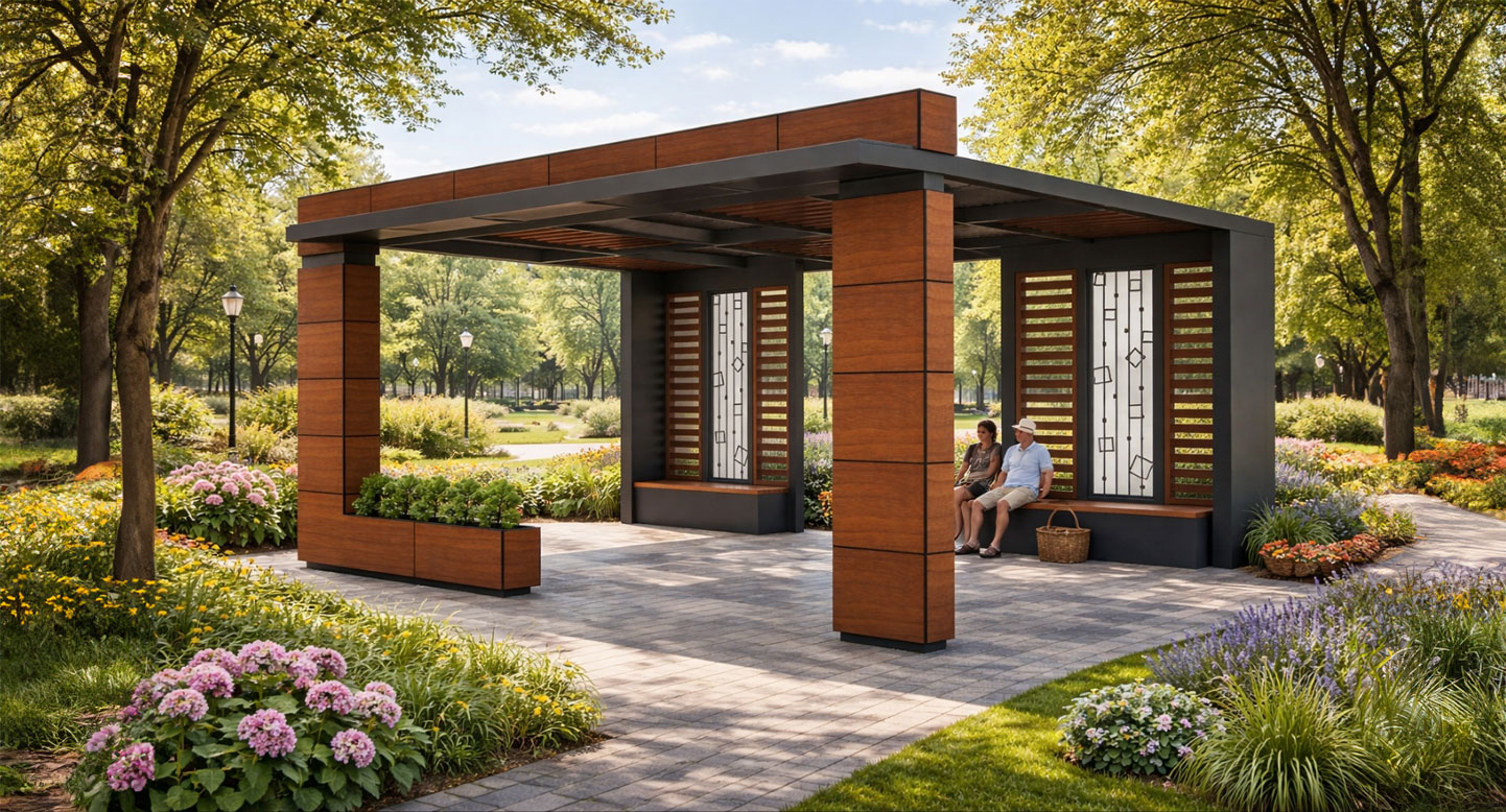우드 브리지 쉼터 (Wood Bridge Shelter)|GC-P-714B 제품목록으로 바로가기 자료 및 바로가기 나라장터 바로연결 도면 다운로드 시공사진 보러가기 기타 따뜻한 우드 패널과 슬랫을 적용해 편안한 분위기를 만들고, 개방 구조와 식재 박스로 자연스러운 휴식과 소통을 유도하는 쉼터입니다. 제품명 우드 브리지 쉼터 (Wood Bridge Shelter)|GC-P-714B 물품식별번호 25639129 규격 6,000 × 3,700 × 2,900(H) 재질 stl, galvanized, hard wood, polycarbonate 우드 브리지 쉼터 (Wood Bridge Shelter)|GC-P-714B 물품식별번호 25639129 규격 6,000 × 3,700 × 2,900(H) 재질 stl, galvanized, hard wood, polycarbonate 기타 따뜻한 우드 패널과 슬랫을 적용해 편안한 분위기를 만들고, 개방 구조와 식재 박스로 자연스러운 휴식과 소통을 유도하는 쉼터입니다. 자료 및 바로가기 나라장터 바로연결 도면 다운로드 시공사진 보러가기