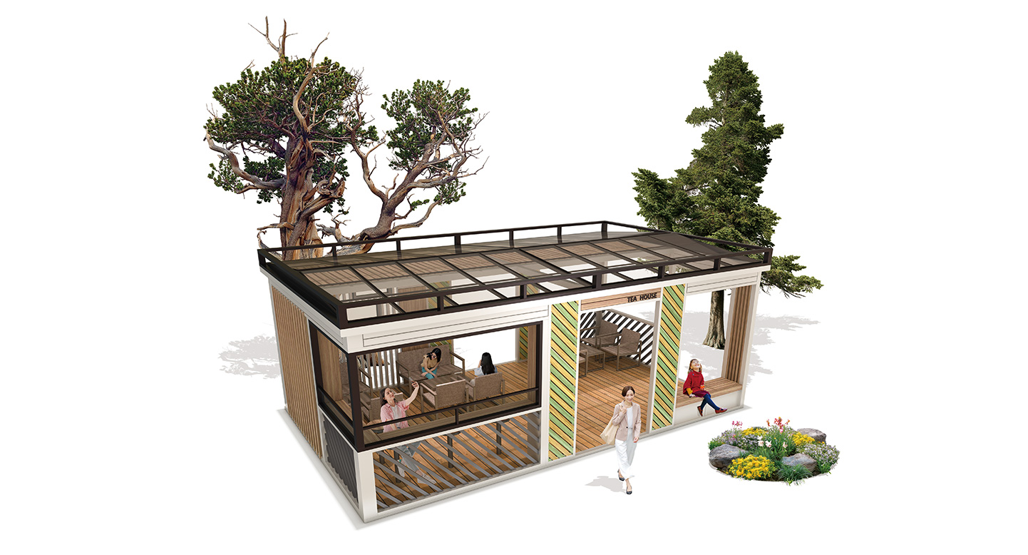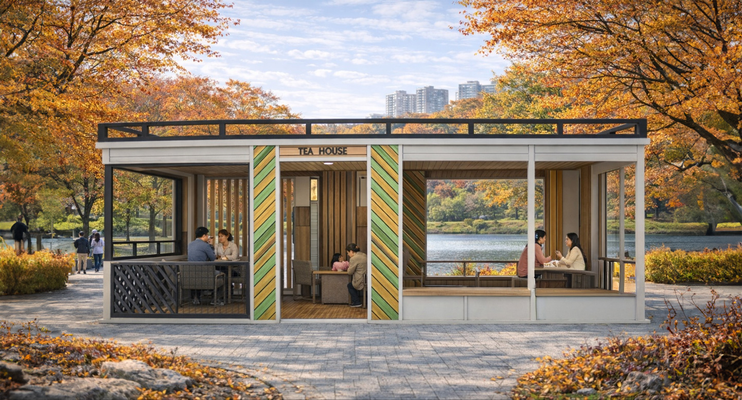 스트리우드 라운지 (Striwood Lounge)|GCP-780-1 제품목록으로 바로가기 자료 및 바로가기 나라장터 바로연결 도면 다운로드 시공사진 보러가기 기타 사선 우드 패턴이 포인트인 스트리우드는 내부와 외부가 자연스럽게 연결되는 깔끔한 쉘터형 티하우스입니다. 컴팩트한 구성 안에 아늑함을 담았습니다. 제품명 스트리우드 라운지 (Striwood Lounge)|GCP-780-1 물품식별번호 25651469 규격 8,000 × 4,800 × 3,150(H) 재질 stl, galvanized, polycarbonate, hard wood, hpl 스트리우드 라운지 (Striwood Lounge)|GCP-780-1 물품식별번호 25651469 규격 8,000 × 4,800 × 3,150(H) 재질 stl, galvanized, polycarbonate, hard wood, hpl 기타 사선 우드 패턴이 포인트인 스트리우드는 내부와 외부가 자연스럽게 연결되는 깔끔한 쉘터형 티하우스입니다. 컴팩트한 구성 안에 아늑함을 담았습니다. 자료 및 바로가기 나라장터 바로연결 도면 다운로드 시공사진 보러가기