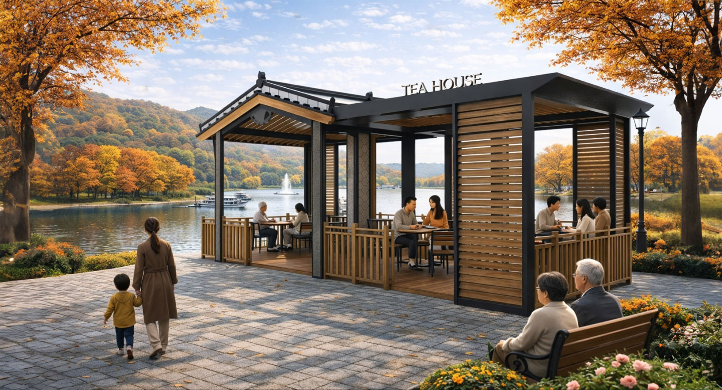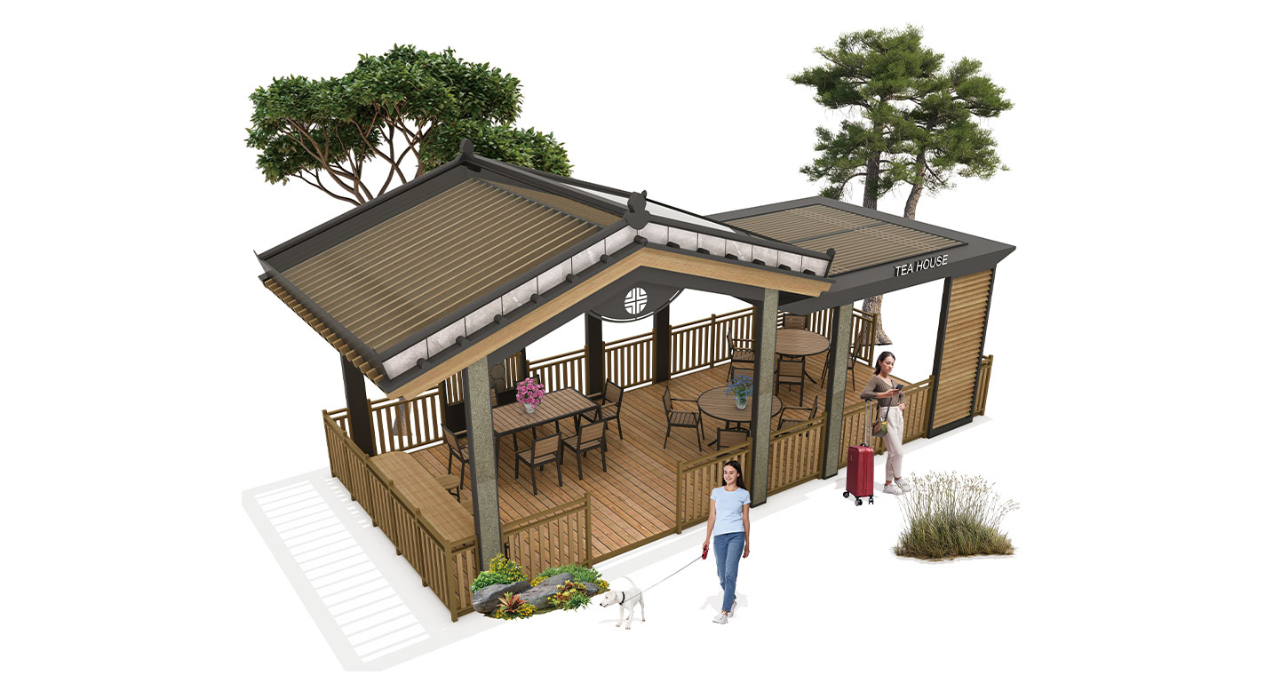기와라운지 블랙 (Giwa Lounge Black)|GC-TH-019 제품목록으로 바로가기 자료 및 바로가기 나라장터 바로연결 도면 다운로드 시공사진 보러가기 기타 한국 전통 기와의 아름다움을 현대적으로 재해석한 기와라운지. 절제된 디테일과 우드 포인트가 어우러진 공간은 편안한 여유를 위한 감각적인 쉼터가 됩니다. 제품명 기와라운지 블랙 (Giwa Lounge Black)|GC-TH-019 물품식별번호 25557016 규격 9,500 × 4,200 × 4,300(H) 재질 stl, galvanized, polycarbonate, hard wood, hpl 기와라운지 블랙 (Giwa Lounge Black)|GC-TH-019 물품식별번호 25557016 규격 9,500 × 4,200 × 4,300(H) 재질 stl, galvanized, polycarbonate, hard wood, hpl 기타 한국 전통 기와의 아름다움을 현대적으로 재해석한 기와라운지. 절제된 디테일과 우드 포인트가 어우러진 공간은 편안한 여유를 위한 감각적인 쉼터가 됩니다. 자료 및 바로가기 나라장터 바로연결 도면 다운로드 시공사진 보러가기