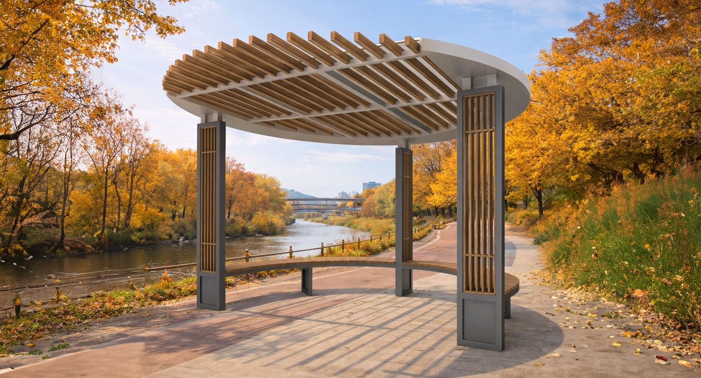 슬릿 아치 퍼걸러 (Slit Arch Pergola)|GC-P-306 제품목록으로 바로가기 자료 및 바로가기 나라장터 바로연결 도면 다운로드 시공사진 보러가기 기타 부드러운 아치 구조와 규칙적인 슬릿 쉐이딩을 결합해 자연스러운 빛 패턴을 만드는 쉼터입니다. 곡선 벤치와 개방형 구조가 어우러져 공원·단지에 편안한 흐름과 휴식 분위기를 제공합니다. 제품명 슬릿 아치 퍼걸러 (Slit Arch Pergola)|GC-P-306 물품식별번호 24099095 규격 3,800 × 3,792 × 2,530(H) 재질 stl, galvanized, polycarbonate, hard wood 슬릿 아치 퍼걸러 (Slit Arch Pergola)|GC-P-306 물품식별번호 24099095 규격 3,800 × 3,792 × 2,530(H) 재질 stl, galvanized, polycarbonate, hard wood 기타 부드러운 아치 구조와 규칙적인 슬릿 쉐이딩을 결합해 자연스러운 빛 패턴을 만드는 쉼터입니다. 곡선 벤치와 개방형 구조가 어우러져 공원·단지에 편안한 흐름과 휴식 분위기를 제공합니다. 자료 및 바로가기 나라장터 바로연결 도면 다운로드 시공사진 보러가기