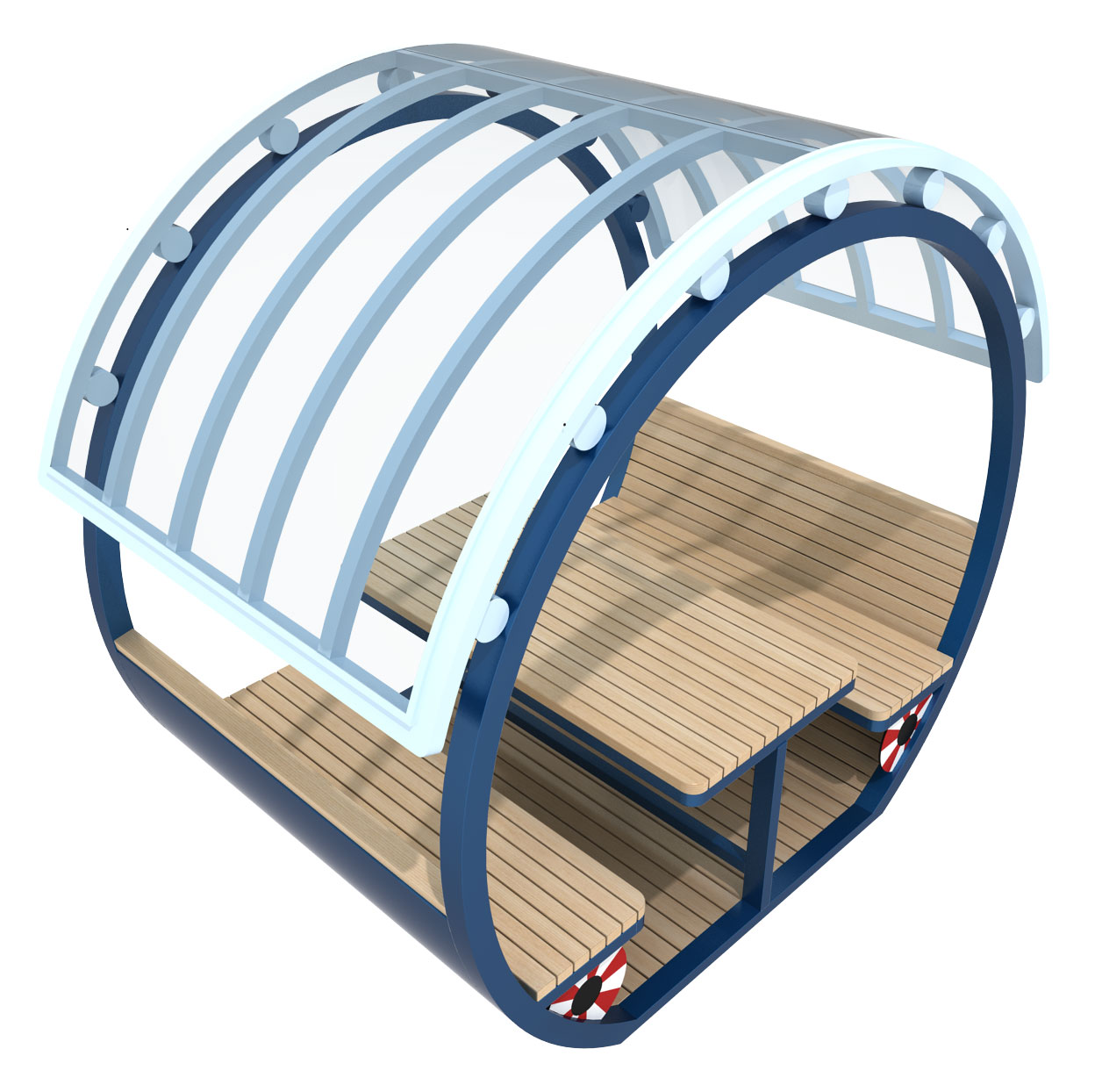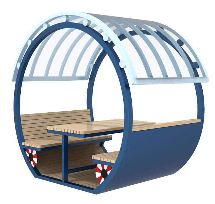 마린웨이브 쉼터 (Marine Wave Shelter)|GCP-414A-1 제품목록으로 바로가기 자료 및 바로가기 나라장터 바로연결 도면 다운로드 시공사진 보러가기 기타 곡선형 프레임과 파도 같은 루프 라인이 경쾌한 해양 분위기를 만들고, 블루 톤과 부표 포인트가 어우러져 휴식과 포토존 기능을 함께 제공하는 감성 쉼터입니다. 제품명 마린웨이브 쉼터 (Marine Wave Shelter)|GCP-414A-1 물품식별번호 25651543 규격 2,672 × 1,660 × 2,437(H) 재질 stl, polycarbonate, hard wood, galvanized 마린웨이브 쉼터 (Marine Wave Shelter)|GCP-414A-1 물품식별번호 25651543 규격 2,672 × 1,660 × 2,437(H) 재질 stl, polycarbonate, hard wood, galvanized 기타 곡선형 프레임과 파도 같은 루프 라인이 경쾌한 해양 분위기를 만들고, 블루 톤과 부표 포인트가 어우러져 휴식과 포토존 기능을 함께 제공하는 감성 쉼터입니다. 자료 및 바로가기 나라장터 바로연결 도면 다운로드 시공사진 보러가기