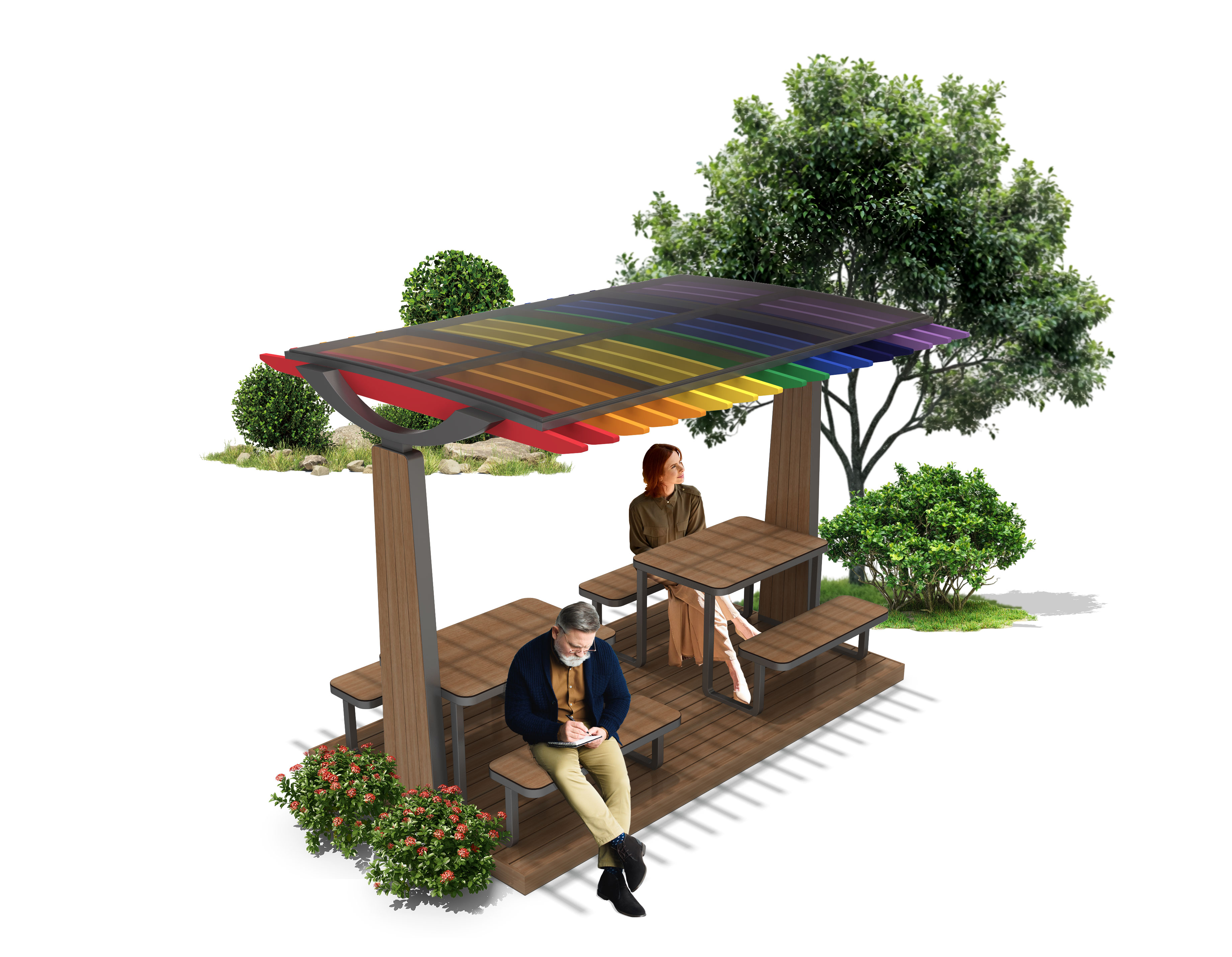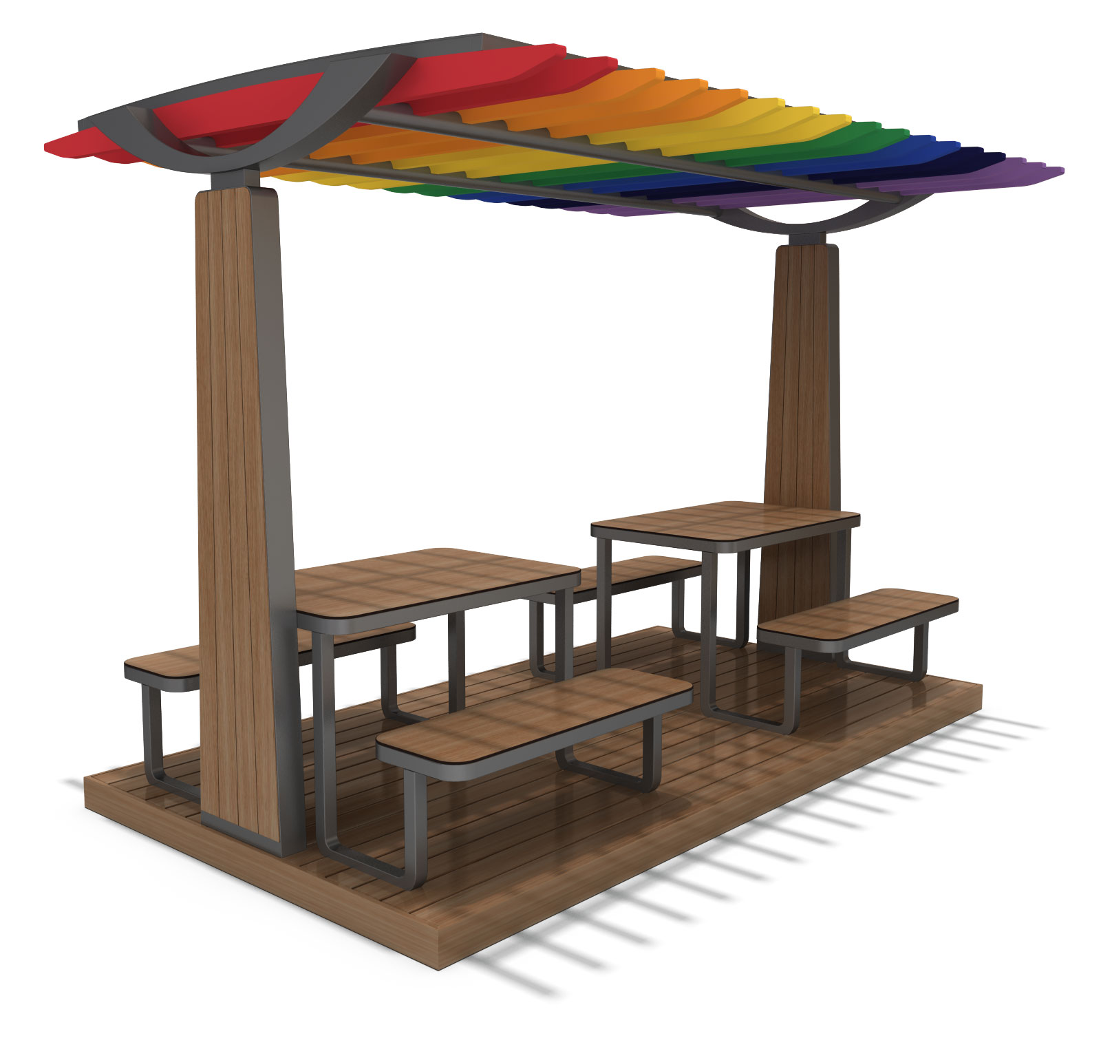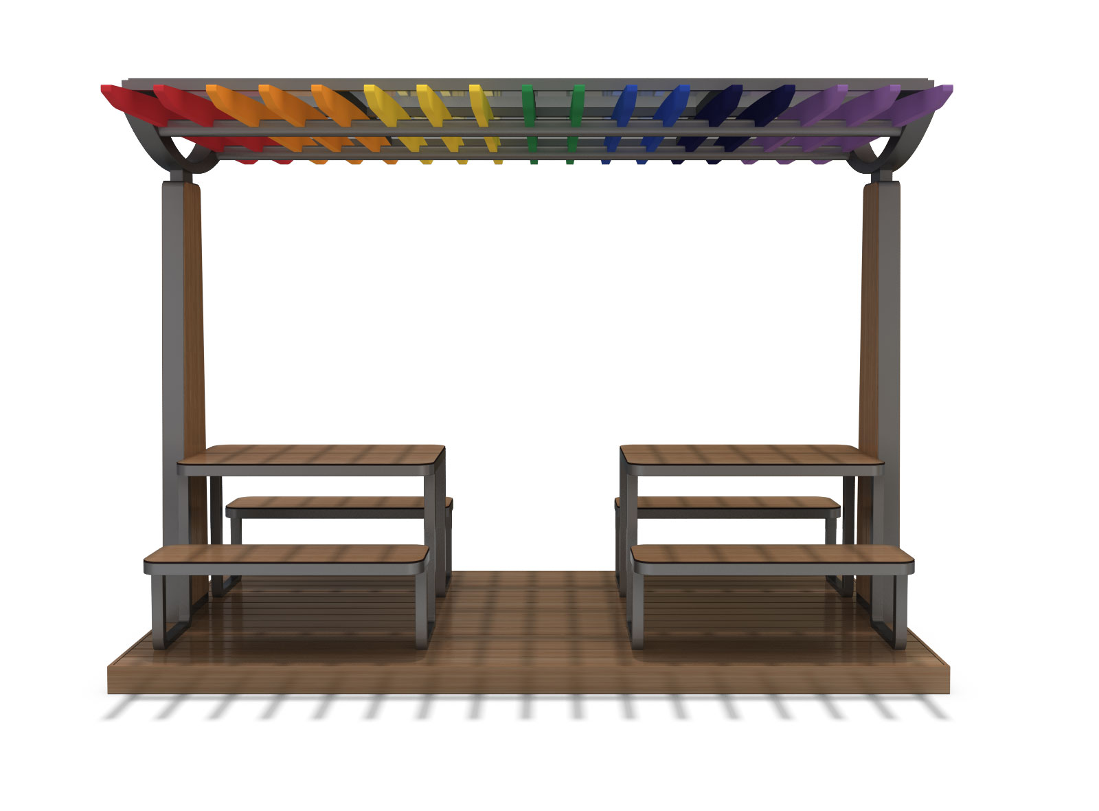 레인보우 피크닉 셸터 (Rainbow Picnic Shelter)|GC-P-418 제품목록으로 바로가기 자료 및 바로가기 나라장터 바로연결 도면 다운로드 시공사진 보러가기 기타 다채로운 컬러 루버 지붕으로 밝고 즐거운 분위기를 표현한 피크닉 쉼터로, 우드·스틸 구조와 넉넉한 테이블 배치가 가족·단체 이용에 활력을 더합니다. 제품명 레인보우 피크닉 셸터 (Rainbow Picnic Shelter)|GC-P-418 물품식별번호 25009535 규격 3,500 × 2,600 × 2,640(H) 재질 stl, hard wood, polycarbonate 레인보우 피크닉 셸터 (Rainbow Picnic Shelter)|GC-P-418 물품식별번호 25009535 규격 3,500 × 2,600 × 2,640(H) 재질 stl, hard wood, polycarbonate 기타 다채로운 컬러 루버 지붕으로 밝고 즐거운 분위기를 표현한 피크닉 쉼터로, 우드·스틸 구조와 넉넉한 테이블 배치가 가족·단체 이용에 활력을 더합니다. 자료 및 바로가기 나라장터 바로연결 도면 다운로드 시공사진 보러가기