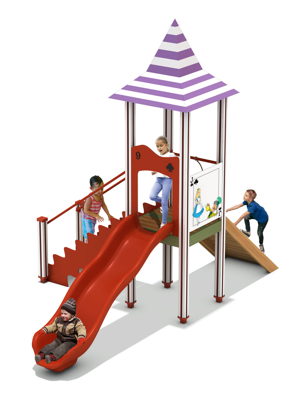 앨리스 카드 타워 슬라이드 (Alice Card Tower Slide)|GGPG-006A-15 제품목록으로 바로가기 자료 및 바로가기 나라장터 바로연결 도면 다운로드 시공사진 보러가기 기타 하트·클로버 카드 문양과 앨리스 일러스트를 포인트로 한 컴팩트 타워형 놀이시설로, 계단–플랫폼–슬라이드로 이어지는 단순하고 명확한 동선을 통해 아이들이 동화 속 한 장면을 오르내리듯 즐기는 스토리텔링형 조합놀이시설입니다. 제품명 앨리스 카드 타워 슬라이드 (Alice Card Tower Slide)|GGPG-006A-15 물품식별번호 25988141|안전인증번호:CA023H10019-3020 규격 4,700 × 2,571 × 3,892(H), 3종 재질 stl, hpl, pe, hard wood 앨리스 카드 타워 슬라이드 (Alice Card Tower Slide)|GGPG-006A-15 물품식별번호 25988141|안전인증번호:CA023H10019-3020 규격 4,700 × 2,571 × 3,892(H), 3종 재질 stl, hpl, pe, hard wood 기타 하트·클로버 카드 문양과 앨리스 일러스트를 포인트로 한 컴팩트 타워형 놀이시설로, 계단–플랫폼–슬라이드로 이어지는 단순하고 명확한 동선을 통해 아이들이 동화 속 한 장면을 오르내리듯 즐기는 스토리텔링형 조합놀이시설입니다. 자료 및 바로가기 나라장터 바로연결 도면 다운로드 시공사진 보러가기