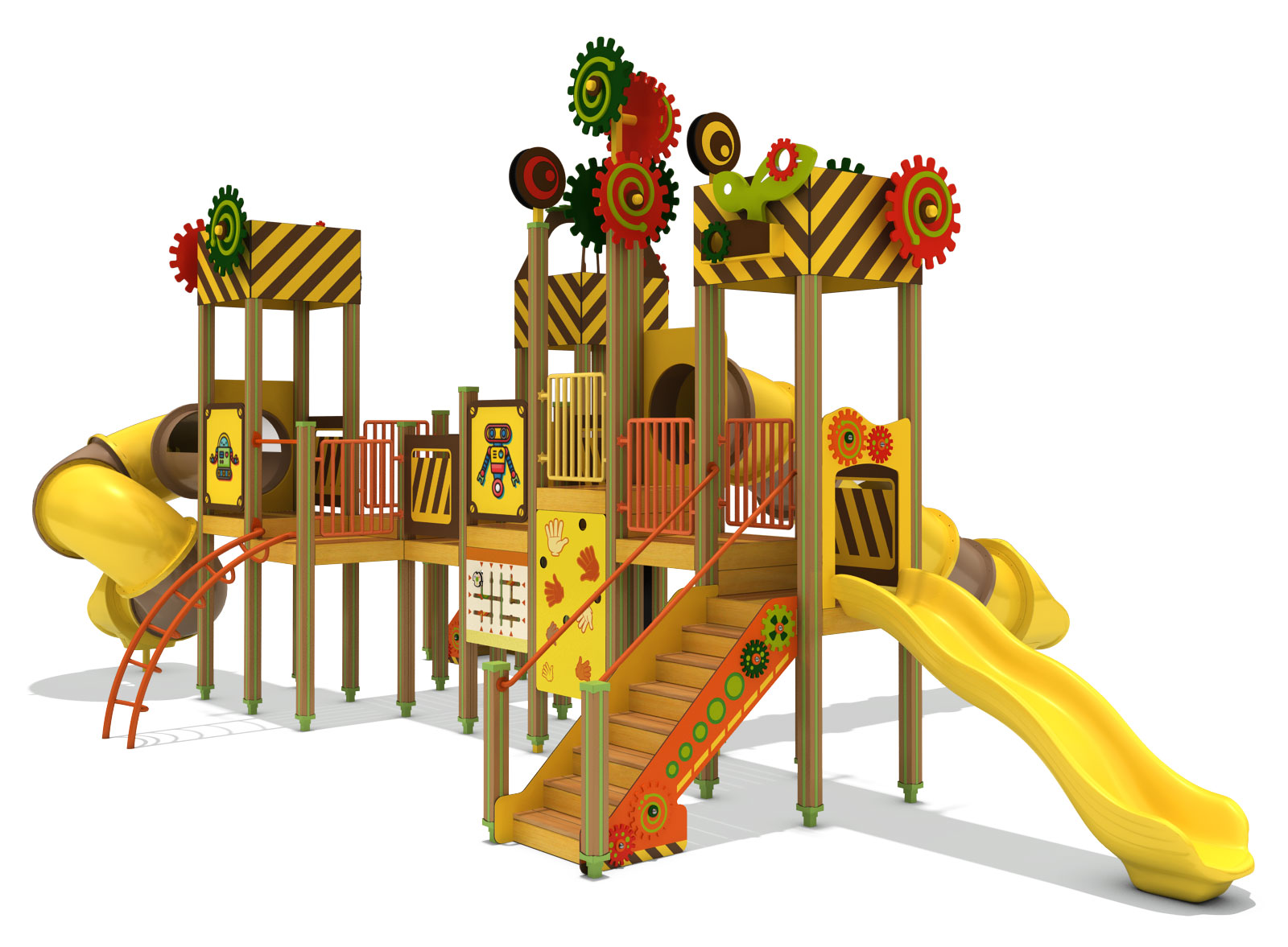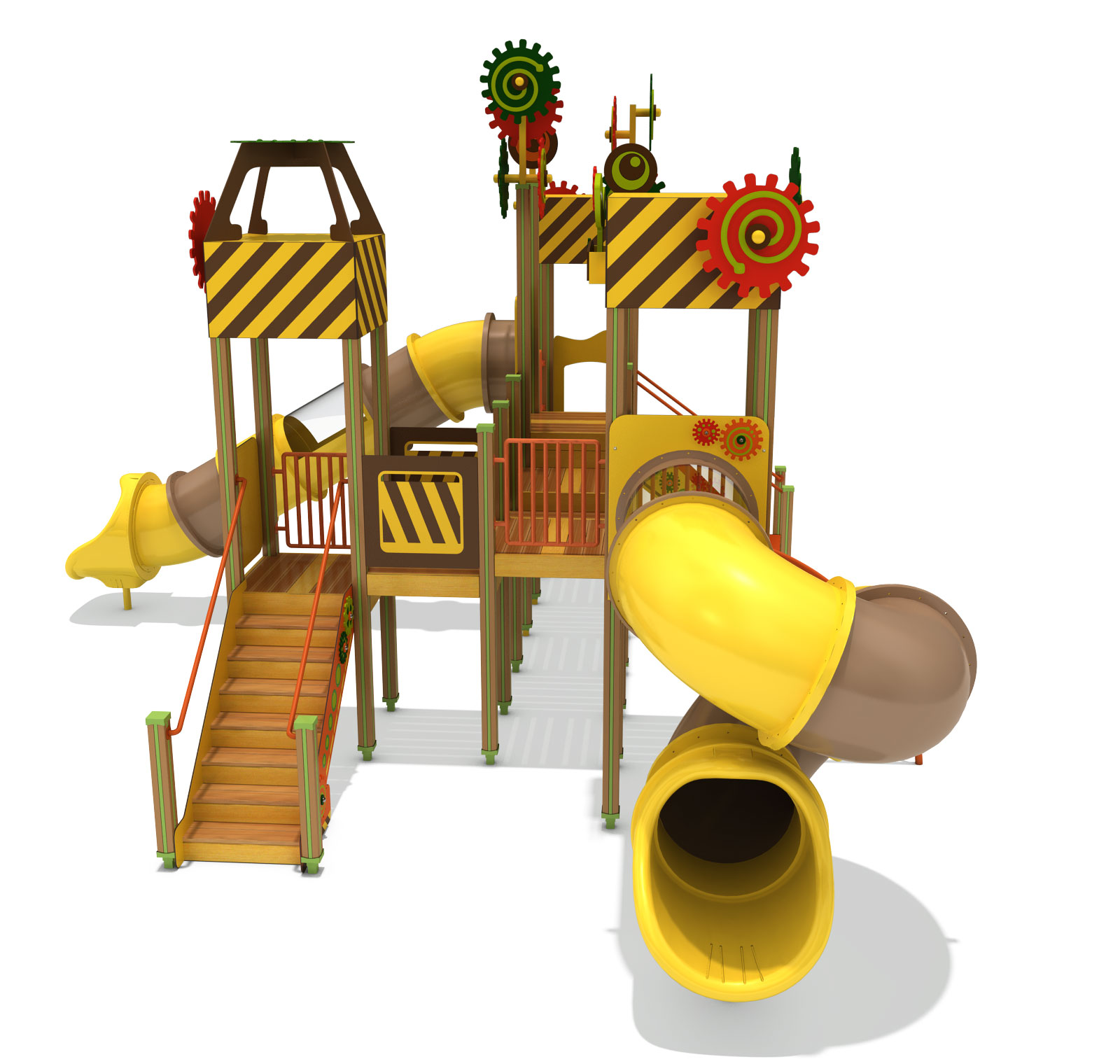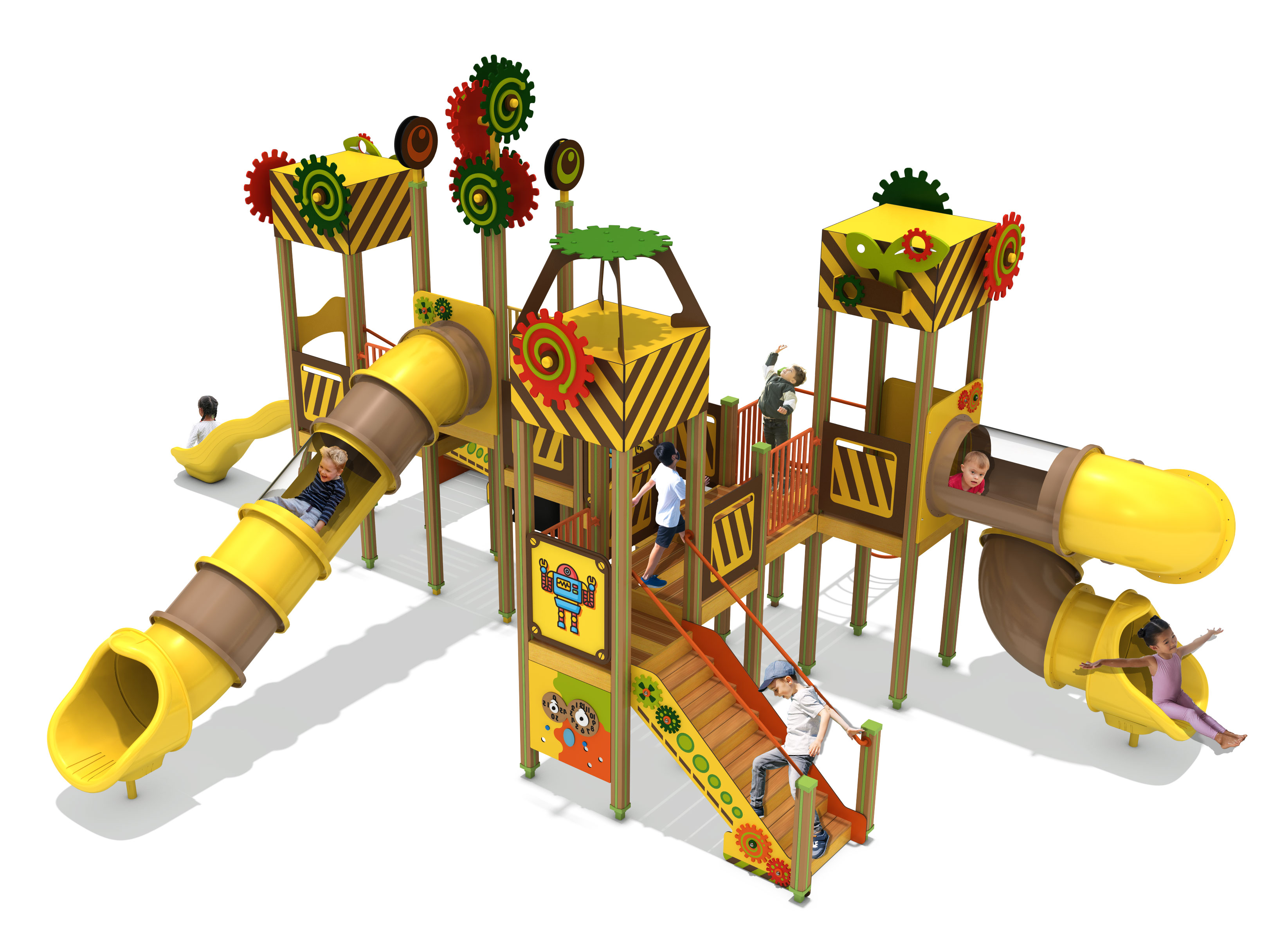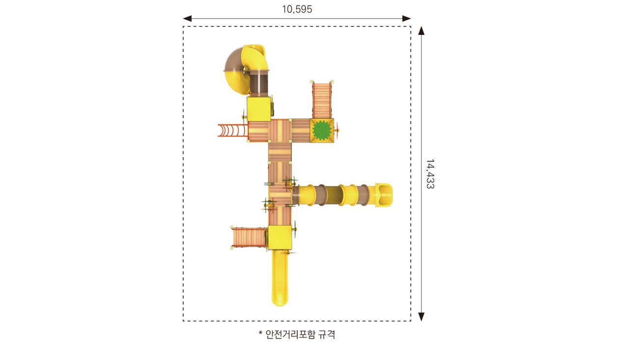 기어와 기계적 형태를 놀이 요소로 풀어내어, 아이들이 마치 움직이는 공장 속을 탐험하는 듯한 경험을 할 수 있도록 디자인 하였습니다. 다양한 높이의 타워와 연결 브릿지, 곡선형 튜브 슬라이드를 통해 자연스러운 이동과 반복 놀이가 이루어지며, 활동성과 호기심을 함께 자극하도록 구성하였습니다.