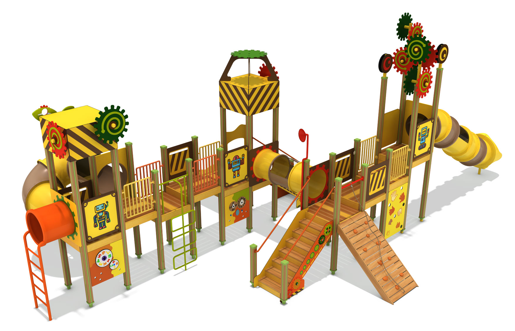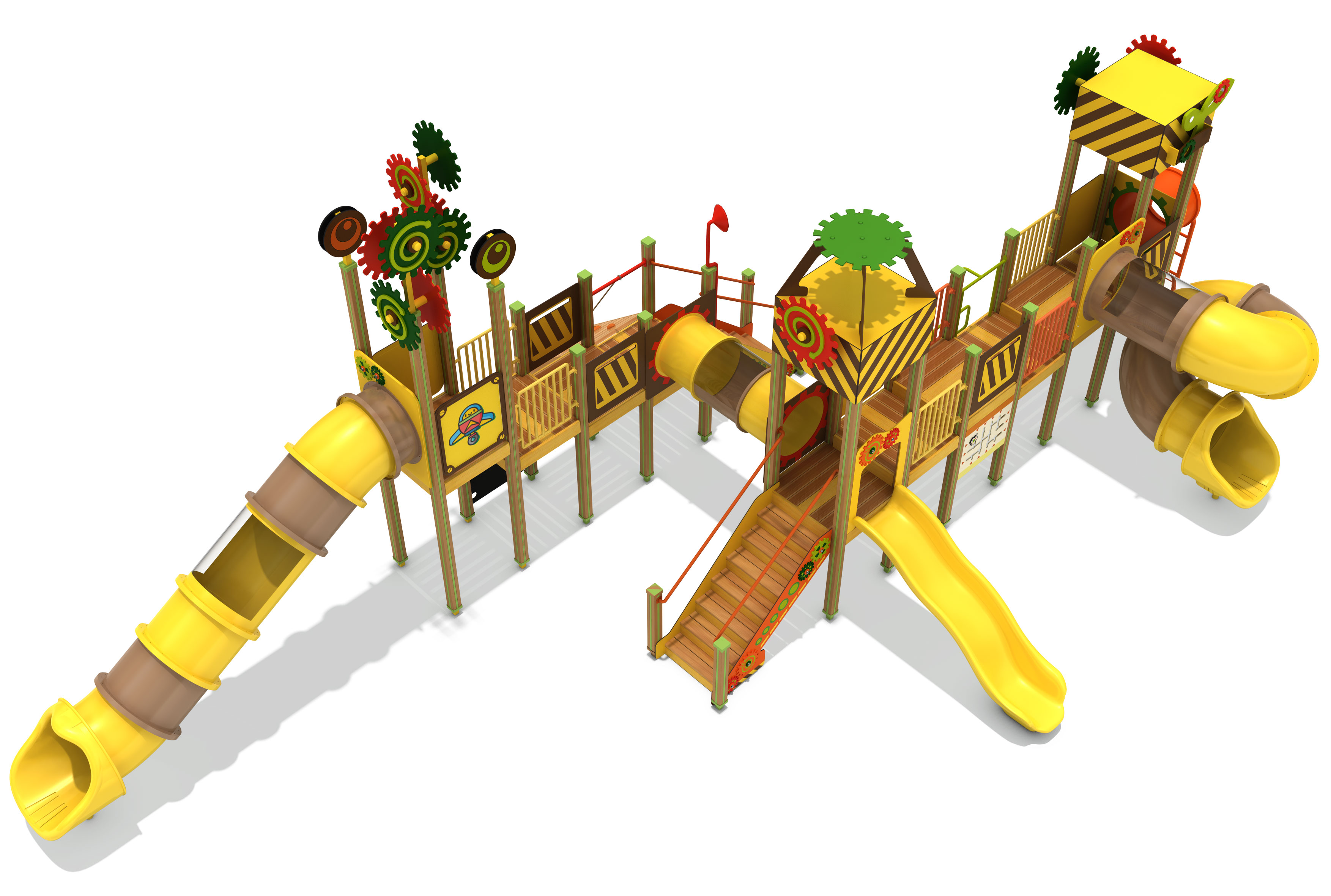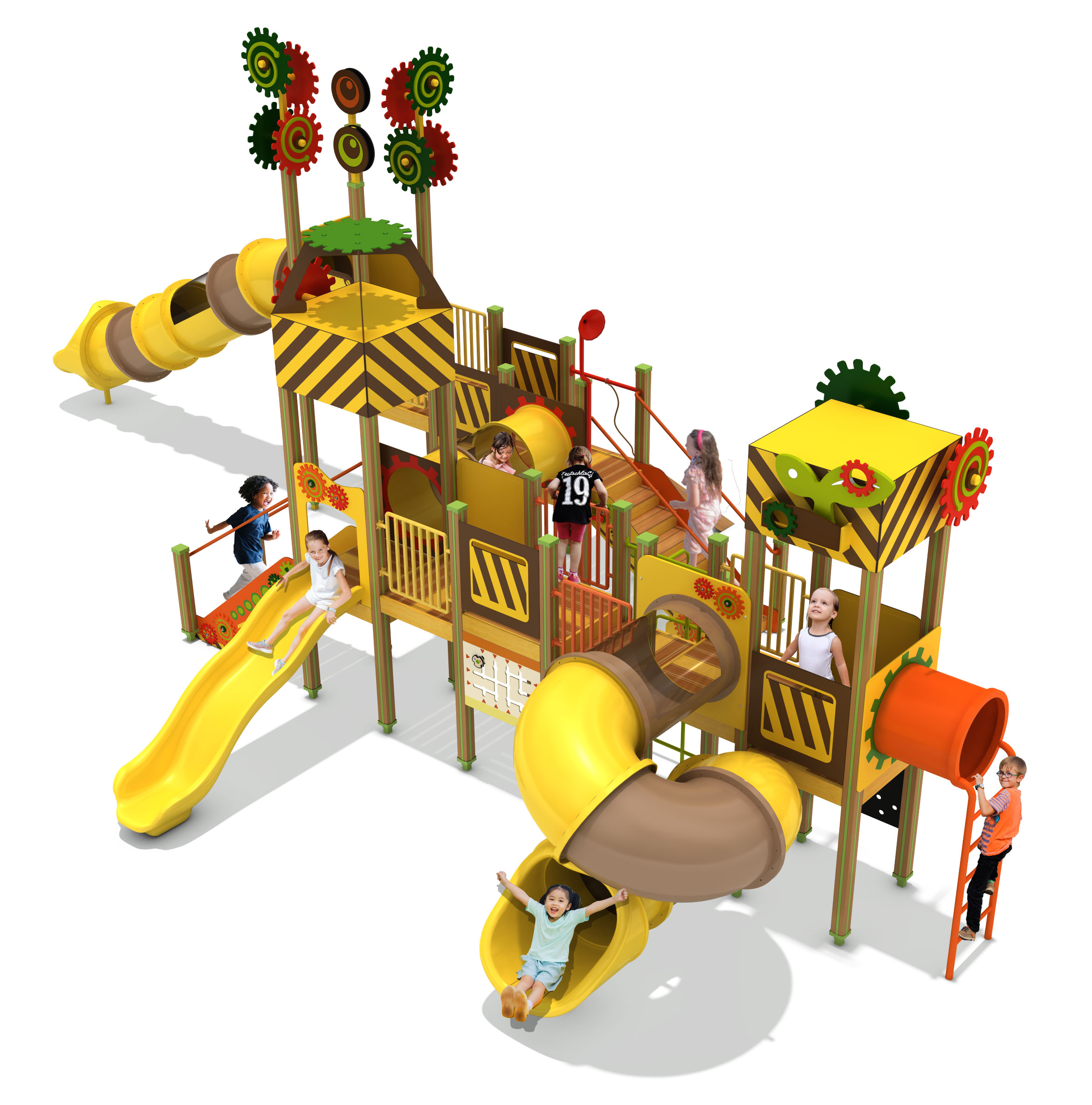 회전하는 기어와 산업적인 패턴을 시각적 모티브로 적용해, 놀이 공간 전체가 하나의 움직이는 도시처럼 느껴지도록 구성한 조합놀이대입니다. 타워·브릿지·튜브 슬라이드가 유기적으로 연결되어 아이들이 자연스럽게 이동하며 탐험하고, 반복적인 오르내림을 통해 신체 활동과 도전 욕구를 함께 키울 수 있도록 설계되었습니다.