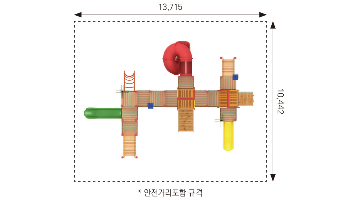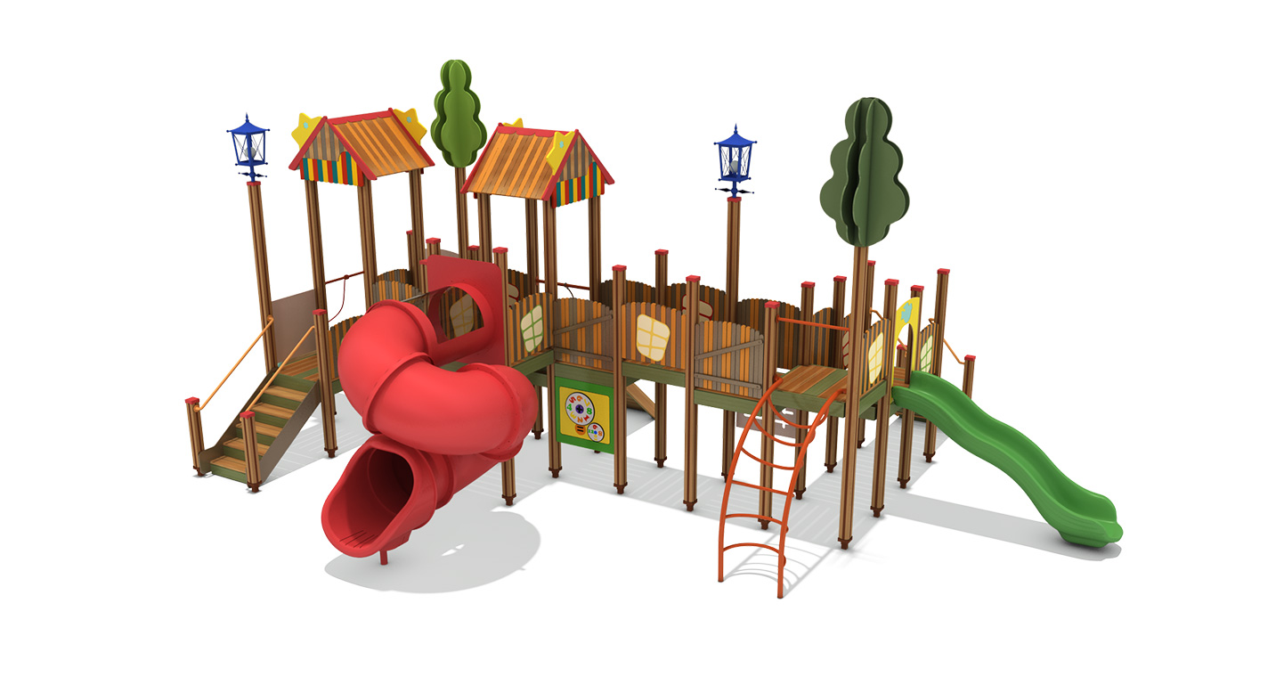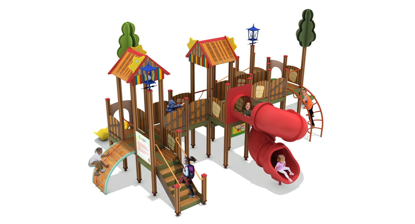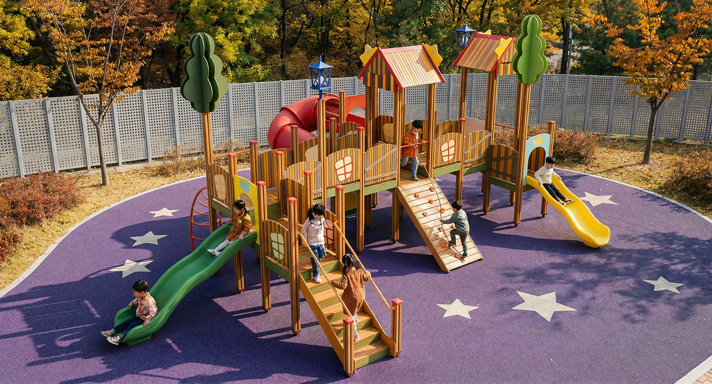 골목형 데크와 타워를 연속적으로 연결해 마을을 탐험하듯 이동하는 놀이 경험을 구현한 조합놀이시설입니다. 터널슬라이드·클라이밍·계단·브릿지 동선을 유기적으로 배치해 아이들의 도전 욕구와 이동 놀이를 자연스럽게 유도하며, 목재 질감과 주택형 지붕 요소로 따뜻한 마을 풍경 속 놀이 환경을 완성했습니다.