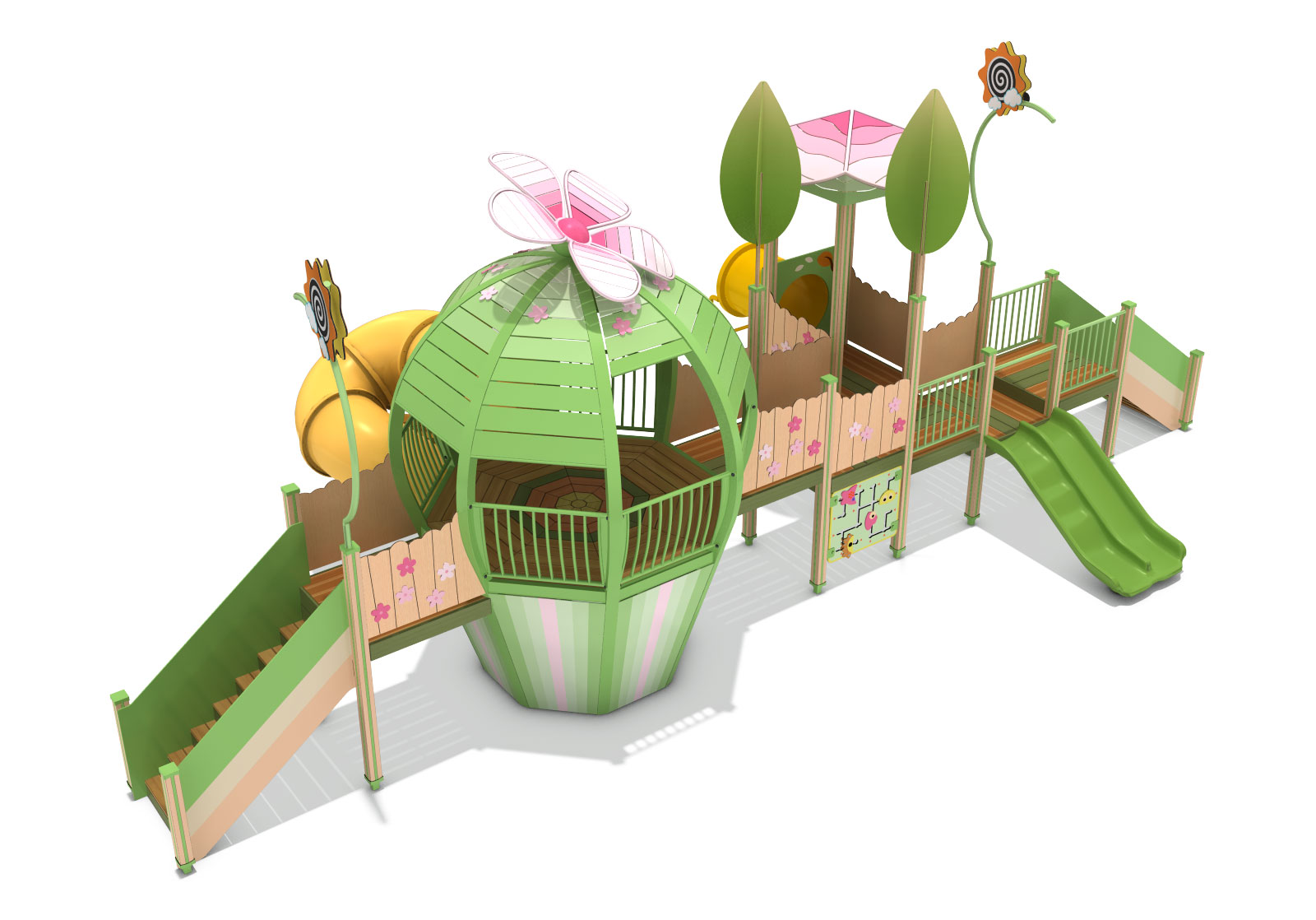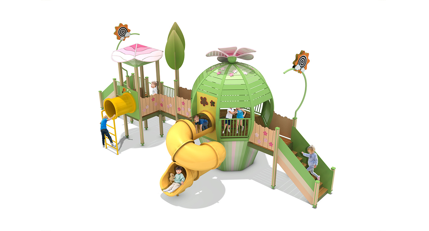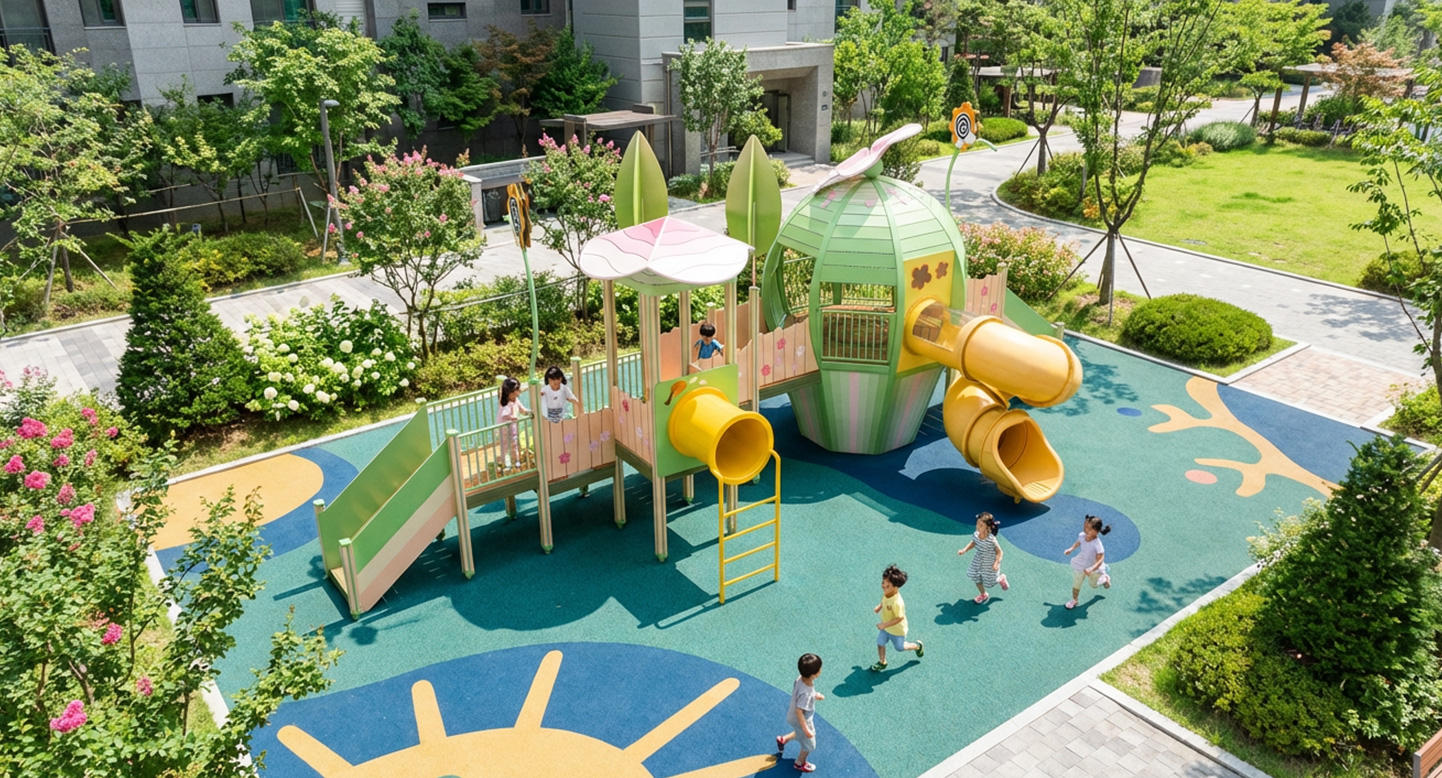 그린 블라썸 플레이하우스 (Green Blossom Playhouse)|GGPG-002A-2 제품목록으로 바로가기 자료 및 바로가기 나라장터 바로연결 도면 다운로드 시공사진 보러가기 기타 꽃봉오리가 활짝 피어나는 정원을 모티브로 한 돔형 중심 공간에 데크·계단·슬라이드를 부드럽게 연결해, 아이들이 머물고 오가며 상상력·교류·탐험 놀이가 자연스럽게 확장되는 가든형 조합놀이시설입니다. 제품명 그린 블라썸 플레이하우스 (Green Blossom Playhouse)|GGPG-002A-2 물품식별번호 25988093|안전인증번호:CA023H10019-3021 규격 11,747 × 5,834 × 4,559(H), 6종 재질 stl, hpl, pe, hard wood 그린 블라썸 플레이하우스 (Green Blossom Playhouse)|GGPG-002A-2 물품식별번호 25988093|안전인증번호:CA023H10019-3021 규격 11,747 × 5,834 × 4,559(H), 6종 재질 stl, hpl, pe, hard wood 기타 꽃봉오리가 활짝 피어나는 정원을 모티브로 한 돔형 중심 공간에 데크·계단·슬라이드를 부드럽게 연결해, 아이들이 머물고 오가며 상상력·교류·탐험 놀이가 자연스럽게 확장되는 가든형 조합놀이시설입니다. 자료 및 바로가기 나라장터 바로연결 도면 다운로드 시공사진 보러가기
