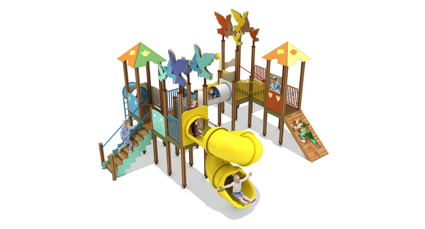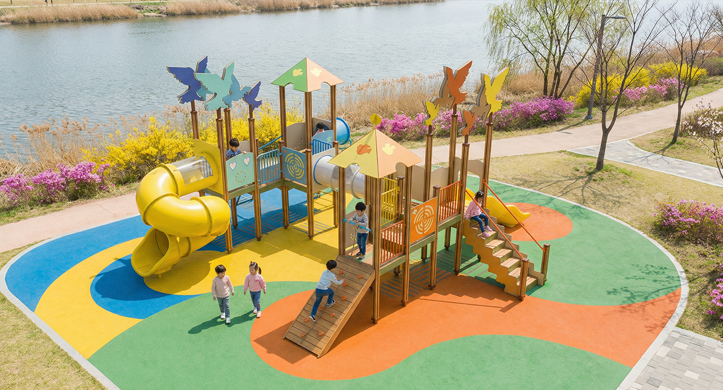 버드 패스 플레이타운 (Bird Path Play Town)|GGPG-001-6 제품목록으로 바로가기 자료 및 바로가기 나라장터 바로연결 도면 다운로드 시공사진 보러가기 기타 숲속 나무 사이를 오가는 새의 이동 경로를 모티브로, 타워·브릿지·터널·슬라이드를 자연스럽게 연결해 아이들이 걷고 오르며 이동 중심의 탐험 놀이를 경험하도록 구성한 숲 테마 조합놀이시설입니다. 제품명 버드 패스 플레이타운 (Bird Path Play Town)|GGPG-001-6 물품식별번호 25095765|안전인증번호:CA023H10019-3020 규격 8,226 × 8,510 × 4,312(H), 8종 재질 stl, hpl, pe, hard wood 버드 패스 플레이타운 (Bird Path Play Town)|GGPG-001-6 물품식별번호 25095765|안전인증번호:CA023H10019-3020 규격 8,226 × 8,510 × 4,312(H), 8종 재질 stl, hpl, pe, hard wood 기타 숲속 나무 사이를 오가는 새의 이동 경로를 모티브로, 타워·브릿지·터널·슬라이드를 자연스럽게 연결해 아이들이 걷고 오르며 이동 중심의 탐험 놀이를 경험하도록 구성한 숲 테마 조합놀이시설입니다. 자료 및 바로가기 나라장터 바로연결 도면 다운로드 시공사진 보러가기