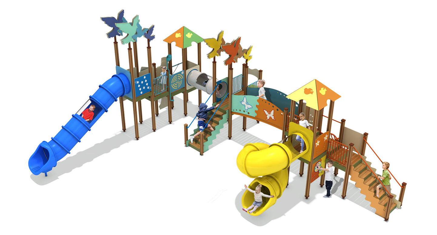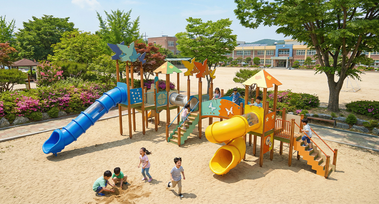 포레스트 윙 어드벤처 (Forest Wing Adventure)|GGPG-001-3 제품목록으로 바로가기 자료 및 바로가기 나라장터 바로연결 도면 다운로드 시공사진 보러가기 기타 숲속을 나는 새의 날개와 이동 경로를 모티브로, 타워·브릿지·슬라이드를 연속적으로 연결해 아이들이 오르내리며 탐험·도전·균형 놀이를 자연스럽게 경험하는 숲 테마 조합놀이시설입니다. 제품명 포레스트 윙 어드벤처 (Forest Wing Adventure)|GGPG-001-3 물품식별번호 25095757|안전인증번호:CA023H10019-3020 규격 11,324 × 11,039 × 4,912(H), 11종 재질 stl, hpl, pe, hard wood 포레스트 윙 어드벤처 (Forest Wing Adventure)|GGPG-001-3 물품식별번호 25095757|안전인증번호:CA023H10019-3020 규격 11,324 × 11,039 × 4,912(H), 11종 재질 stl, hpl, pe, hard wood 기타 숲속을 나는 새의 날개와 이동 경로를 모티브로, 타워·브릿지·슬라이드를 연속적으로 연결해 아이들이 오르내리며 탐험·도전·균형 놀이를 자연스럽게 경험하는 숲 테마 조합놀이시설입니다. 자료 및 바로가기 나라장터 바로연결 도면 다운로드 시공사진 보러가기