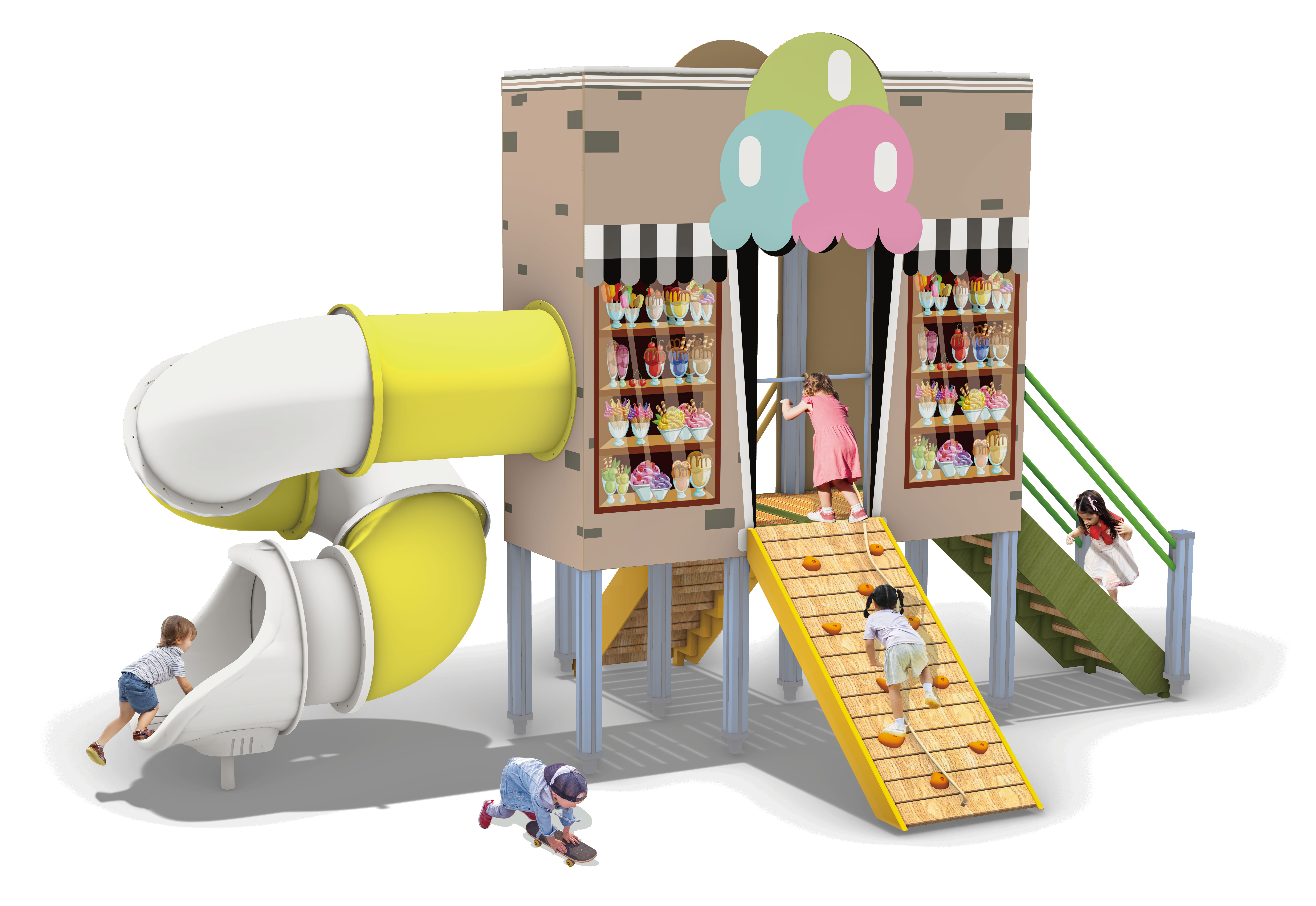 스위트 아이스크림 플레이하우스(Sweet Ice Cream Playhouse)|FNK-043A-4 제품목록으로 바로가기 자료 및 바로가기 나라장터 바로연결 도면 다운로드 시공사진 보러가기 기타 아이스크림 가게를 형상화한 상점형 놀이 구조에 오르기 경사면과 터널형 미끄럼틀을 결합해 아이들이 역할 놀이와 신체 활동을 함께 즐길 수 있도록 구성한 조합 놀이시설이다. 제품명 스위트 아이스크림 플레이하우스(Sweet Ice Cream Playhouse)|FNK-043A-4 물품식별번호 25988187|안전인증번호: CA023H10019-3018 규격 6,420 × 3,758 × 3,715(H), 4종 재질 stl, hpl, pe, hard wood 스위트 아이스크림 플레이하우스(Sweet Ice Cream Playhouse)|FNK-043A-4 물품식별번호 25988187|안전인증번호: CA023H10019-3018 규격 6,420 × 3,758 × 3,715(H), 4종 재질 stl, hpl, pe, hard wood 기타 아이스크림 가게를 형상화한 상점형 놀이 구조에 오르기 경사면과 터널형 미끄럼틀을 결합해 아이들이 역할 놀이와 신체 활동을 함께 즐길 수 있도록 구성한 조합 놀이시설이다. 자료 및 바로가기 나라장터 바로연결 도면 다운로드 시공사진 보러가기