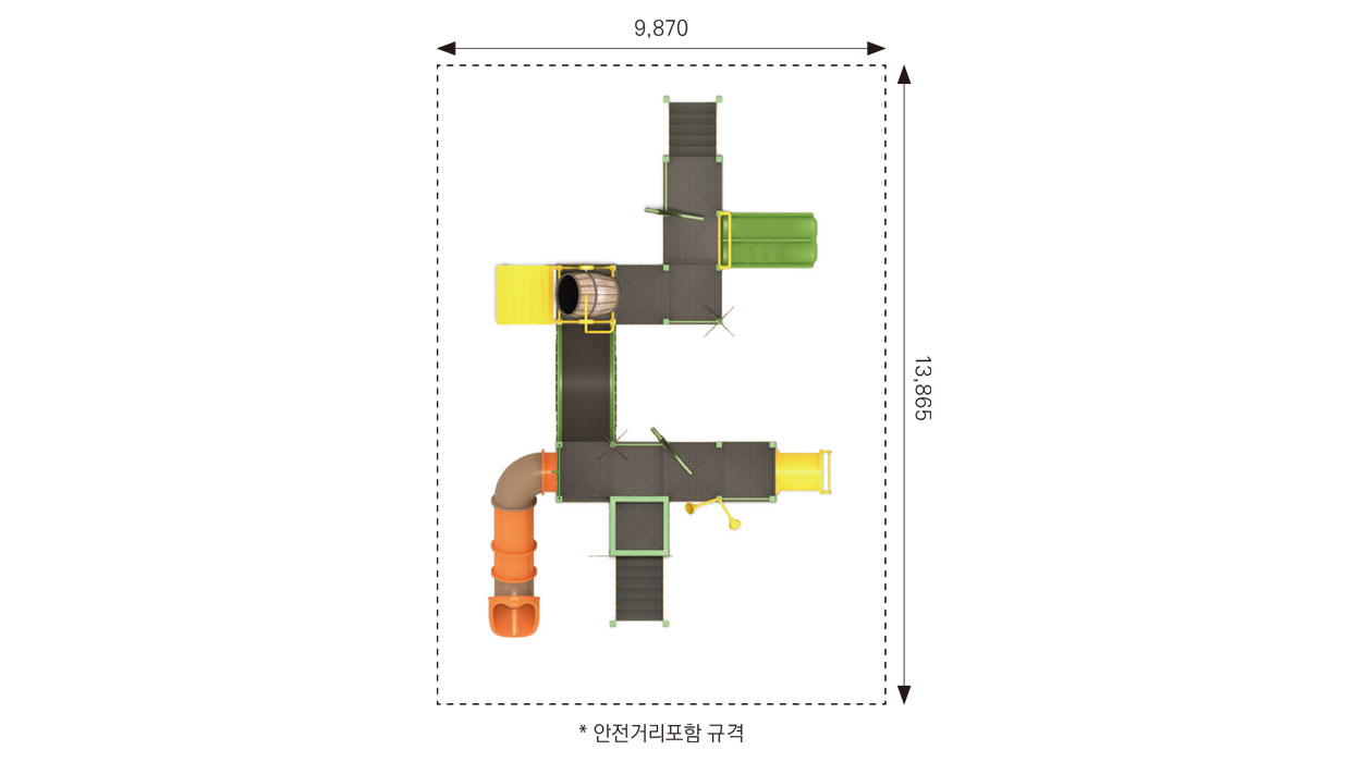 당근 밭과 숲 친구를 모티브로 한 구조에 워터버킷 낙수와 분사형 물놀이 요소, 터널형 미끄럼틀을 결합한 물놀이 조합놀이대이다. 오르기·이동·미끄러지기 동선 곳곳에서 물의 흐름을 직접 체험하도록 구성해 여름철 더위 완화와 함께 신체 활동·감각 자극을 자연스럽게 유도하는 물놀이 특화 놀이시설이다.