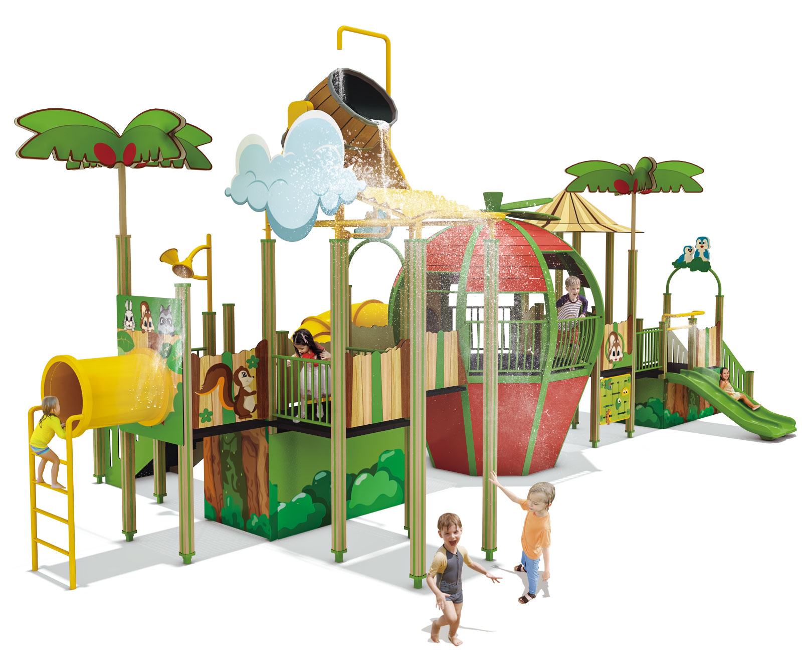 열대 과일과 정글을 모티브로 한 구조에 워터버킷 낙수, 분사형 워터 스프레이, 터널형 미끄럼틀을 결합한 물놀이 조합놀이대로, 아이들이 오르기·이동·미끄러지기 놀이 과정에서 물의 떨어짐과 흐름을 직접 체험하며 여름철 신체 활동과 감각 놀이를 동시에 즐길 수 있도록 구성하였다.