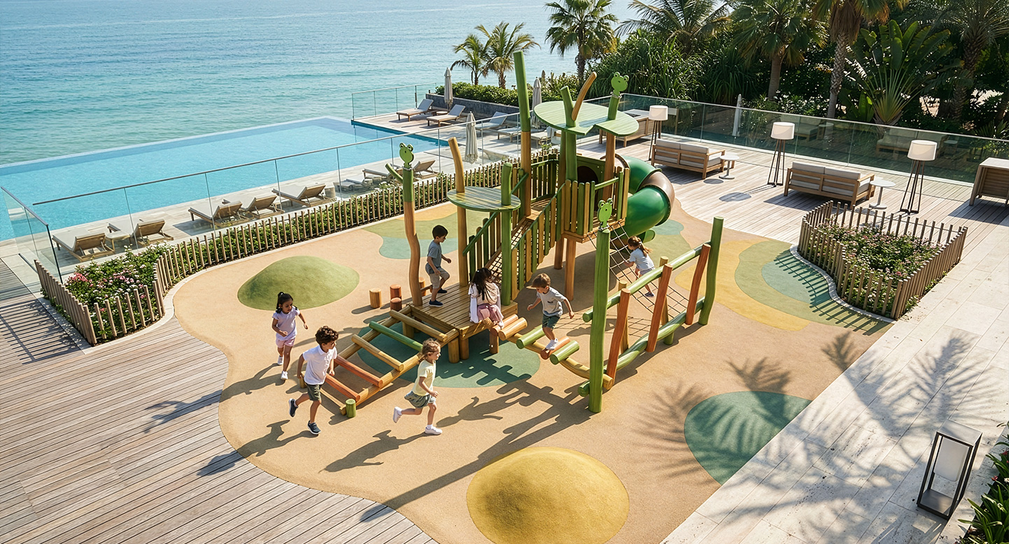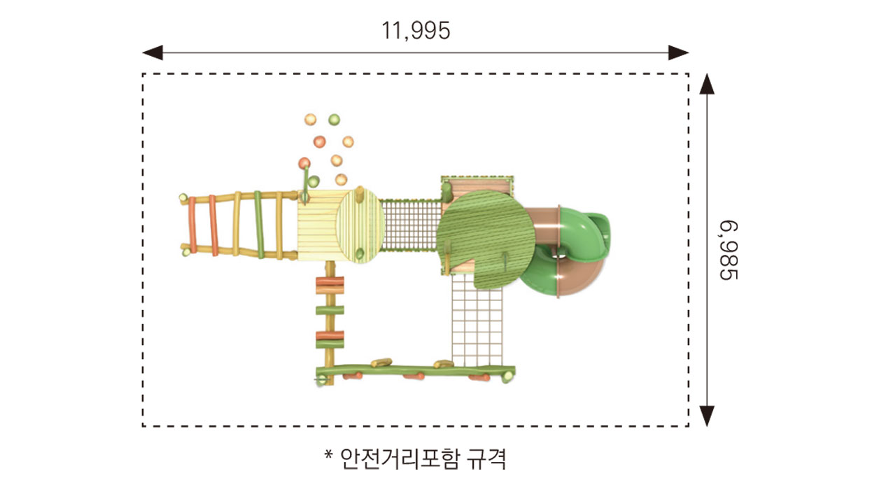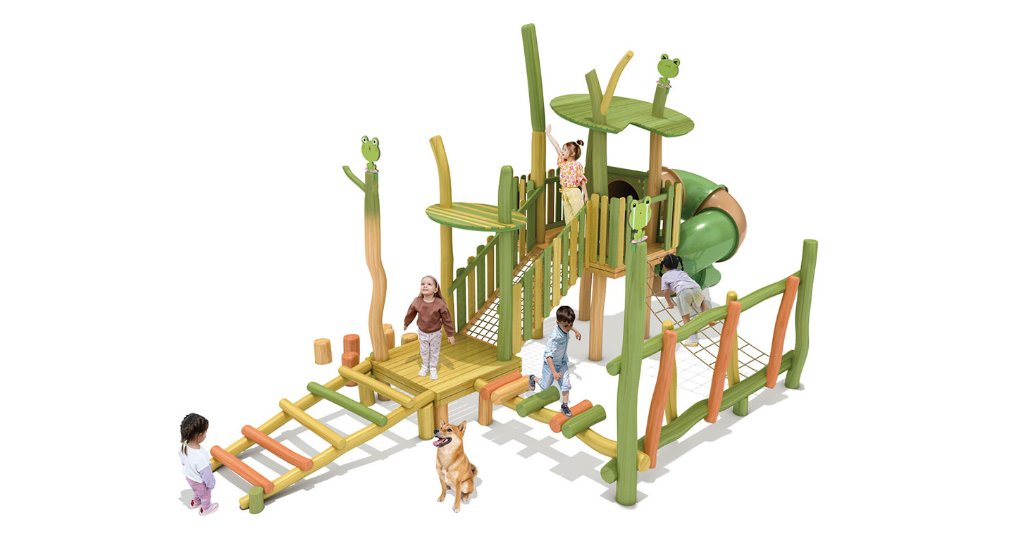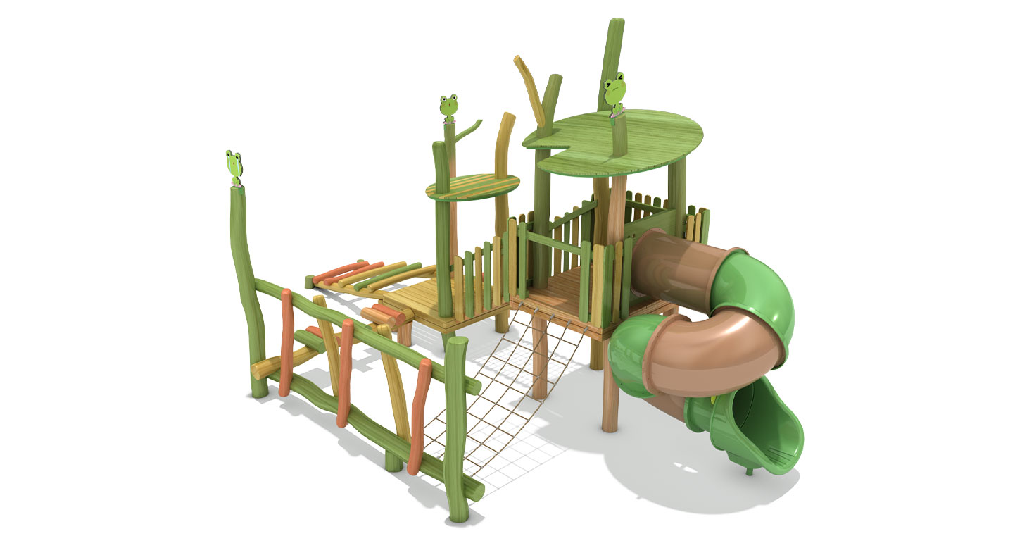 로비니아 원목의 자연스러운 형태에 개구리 모티브를 더해 징검·브리지·오르기·미끄럼 요소를 하나의 흐름으로 구성한 로비니아 조합놀이대이다. 아이들이 뛰고 건너며 이동하는 과정에서 균형감과 신체 활동, 숲속 탐험 놀이를 자연스럽게 경험하도록 설계되었다.