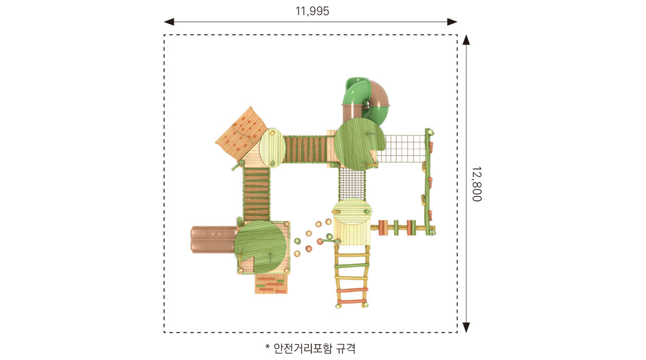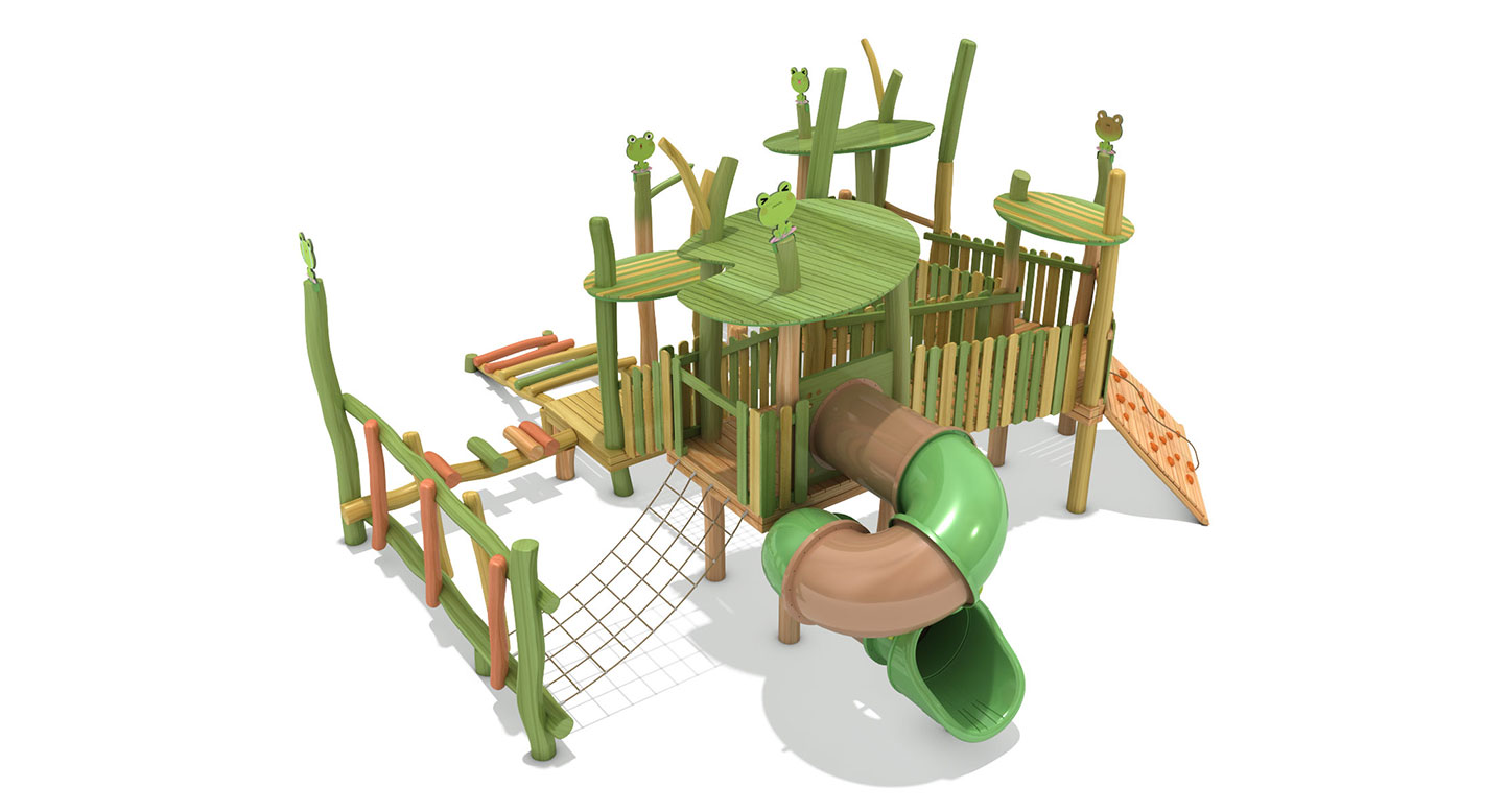 로비니아 원목을 활용해 잎사귀 쉼터와 동물 모티브를 결합한 놀이 구조로, 데크·브리지·징검·오르기 요소를 하나의 순환 동선으로 구성한 로비니아 조합놀이대이다. 아이들이 걷고 건너며 자연 속 친구들과 어울리듯 균형감과 신체 활동, 상상 놀이를 함께 경험하도록 설계되었다.