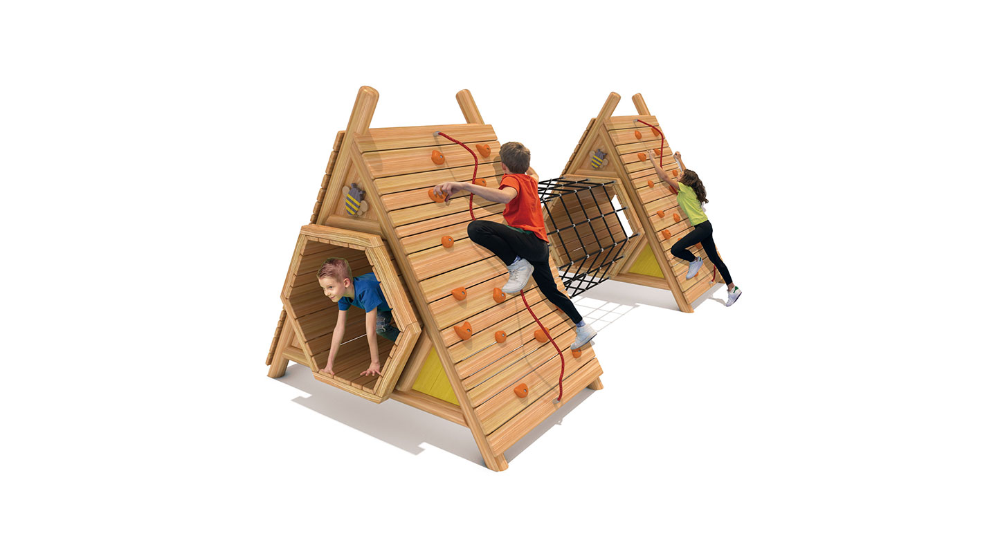 로비니아 목재로 제작된 벌집 모양의 터널과 클라이밍 벽이 연결된 구조로, 아이들이 기어가고 오르며 균형을 잡는 전신 활동을 즐길 수 있는 복합 놀이시설입니다. 자연의 벌집을 연상시키는 디자인은 아이들의 호기심과 상상력을 자극하고, 놀이 과정에서 근력·협응력·균형감각이 자연스럽게 발달됩니다.