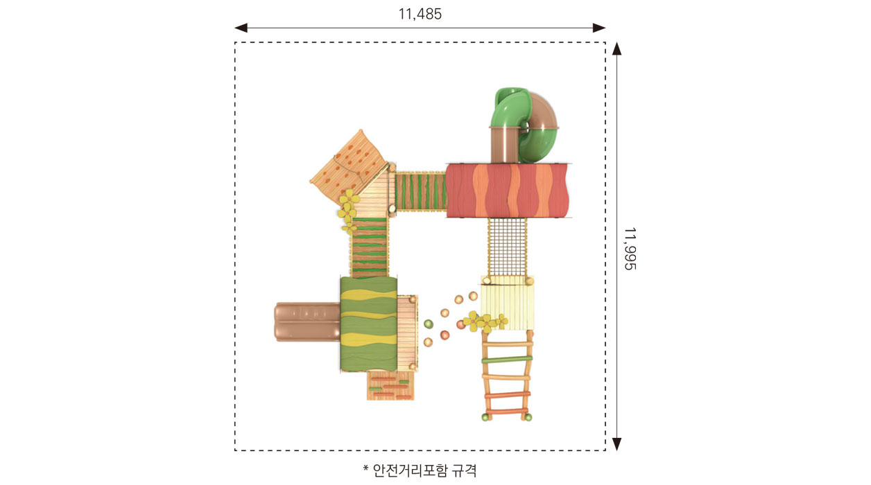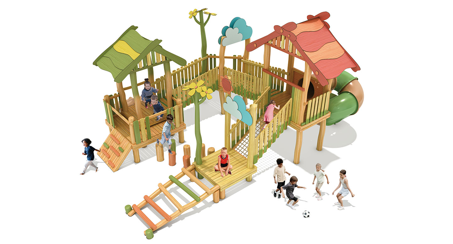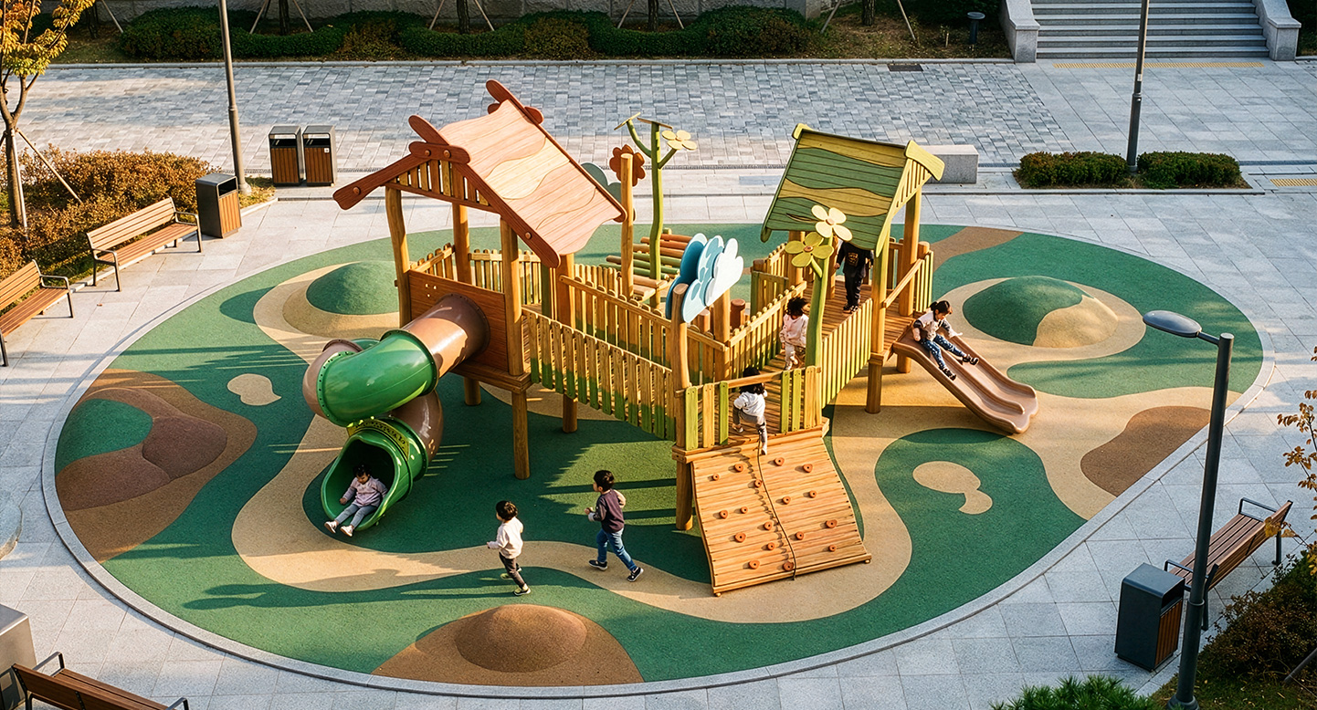 로비니아 원목을 사용해 꽃과 구름 모티브의 오두막과 데크를 연결한 로비니아 조합놀이대로, 걷기·건너기·오르기 동선을 따라 이동하며 아이들이 자연 속 작은 마을을 탐험하듯 놀이하도록 구성하였다. 균형감과 신체 활동, 상상 놀이가 조화롭게 이루어지는 자연친화형 놀이공간이다.