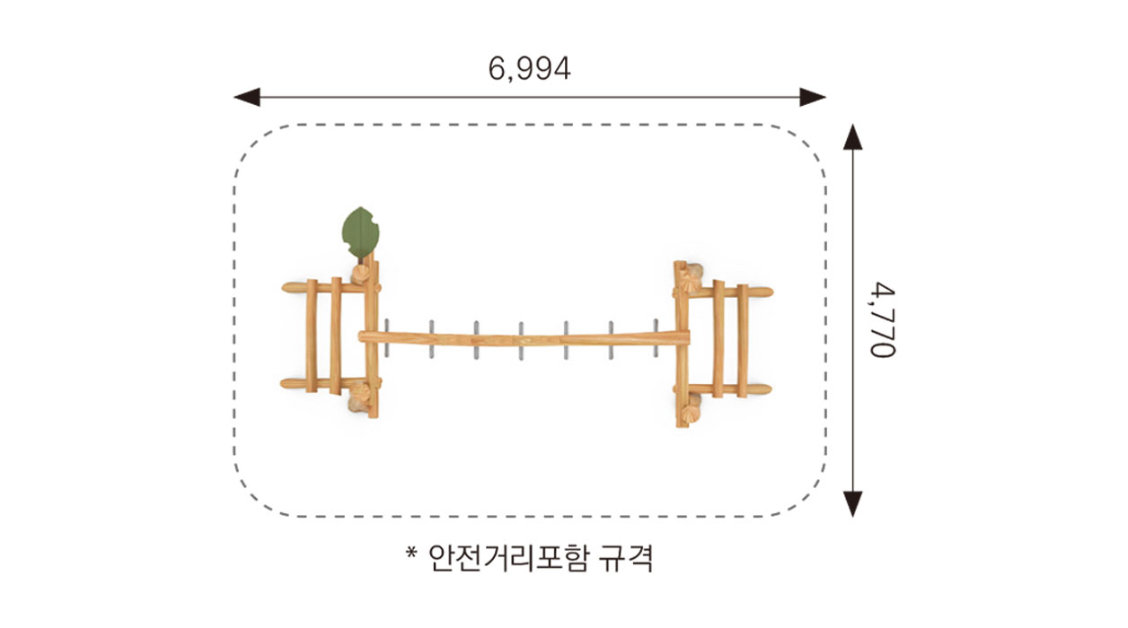 F&K-RO-005(오리구름다리) 안전인증번호 | CA023H074-20045 제품목록으로 바로가기 자료 및 바로가기 나라장터 바로연결 도면 다운로드 시공사진 보러가기 기타 링 형태의 손잡이를 잡고 매달려 이동하는 구조로, 아이들이 상체 근력과 순발력, 협응력을 기를 수 있는 체험형 놀이시설입니다. 자연목 프레임과 귀여운 오리 디테일이 더해져 즐거운 분위기 속에서 도전과 성취감을 경험할 수 있습니다. 제품명 F&K-RO-005(오리구름다리) 안전인증번호 | CA023H074-20045 물품식별번호 24050909 규격 3,994 × 1,770 × 2,300(H) 재질 robinia, stl F&K-RO-005(오리구름다리) 안전인증번호 | CA023H074-20045 물품식별번호 24050909 규격 3,994 × 1,770 × 2,300(H) 재질 robinia, stl 기타 링 형태의 손잡이를 잡고 매달려 이동하는 구조로, 아이들이 상체 근력과 순발력, 협응력을 기를 수 있는 체험형 놀이시설입니다. 자연목 프레임과 귀여운 오리 디테일이 더해져 즐거운 분위기 속에서 도전과 성취감을 경험할 수 있습니다. 자료 및 바로가기 나라장터 바로연결 도면 다운로드 시공사진 보러가기
