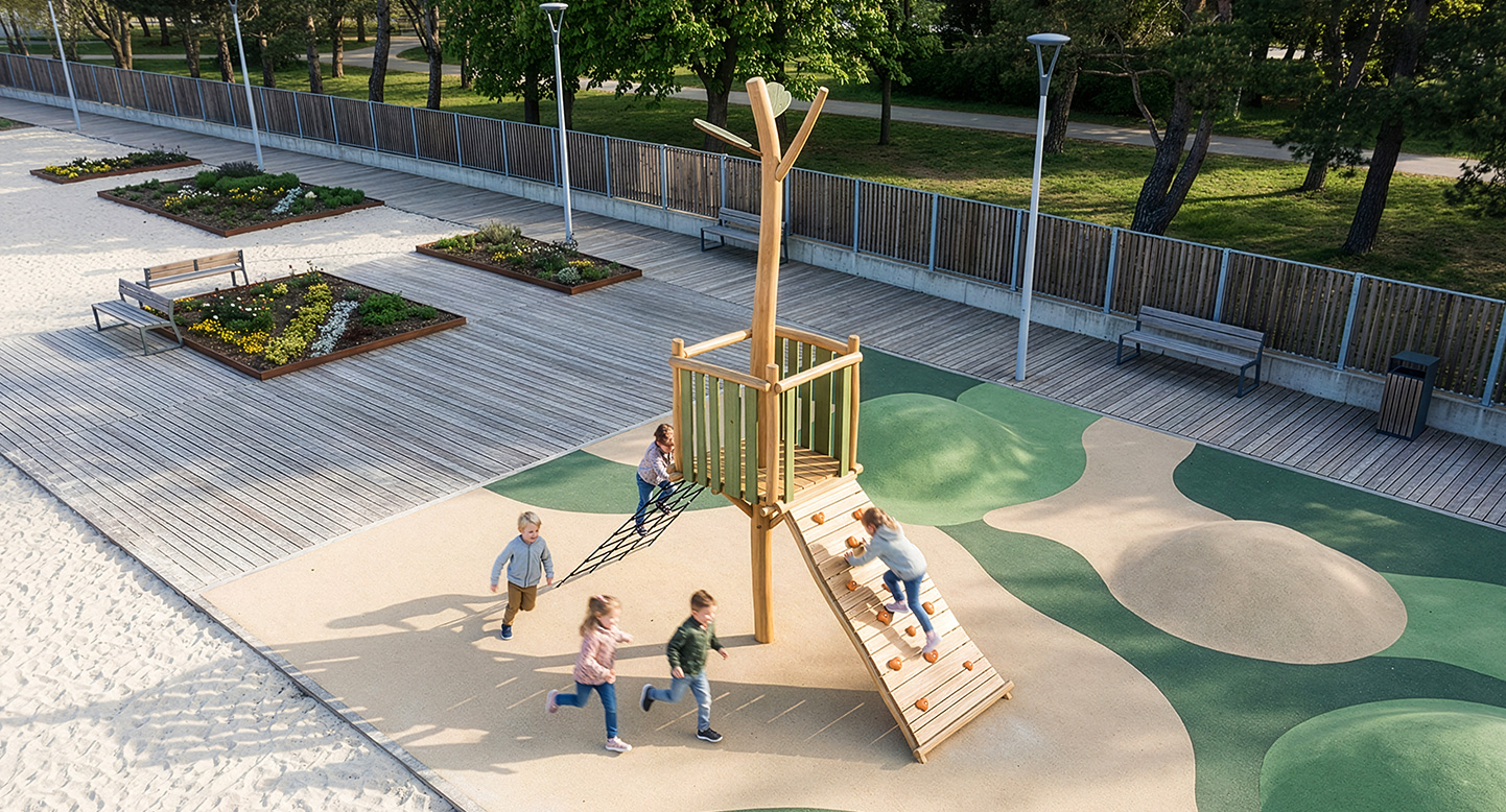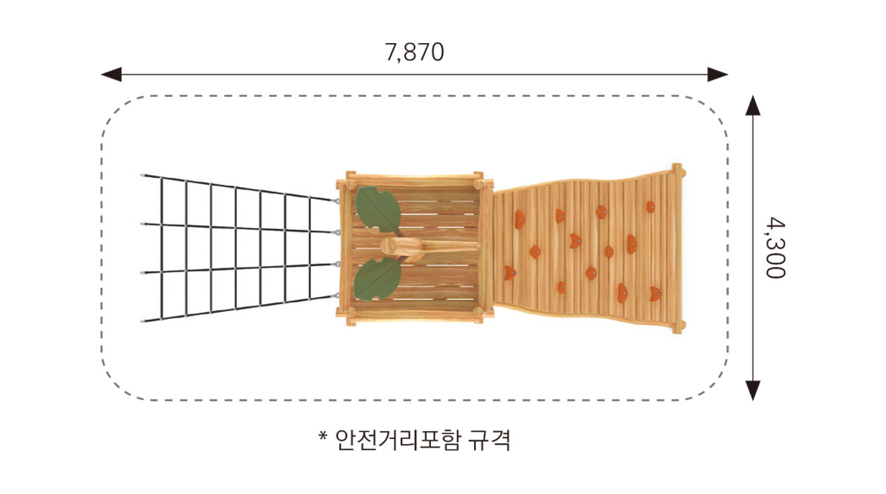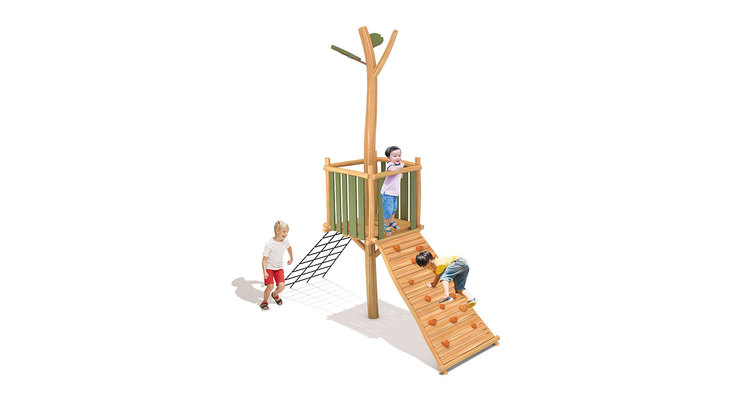 목재 타워 구조에 클라이밍 보드와 네트 사다리를 결합한 놀이시설로, 아이들이 오르고 내려가며 전신 근력을 발달시키고 높은 곳에 올라 성취감을 느낄 수 있는 전망형 놀이대입니다. 나무를 형상화한 디자인은 자연 속에 있는 듯한 경험을 제공하며, 상상 놀이와 모험심을 동시에 자극합니다.